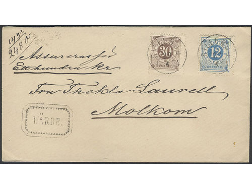 Sweden. Facit 32, 25 on cover, 12+30 öre on very beautiful insured cover sent from SILLERUD 29.4.1884 via GILLBERGA 29.4.1884 to Molkom. Superb. Show less