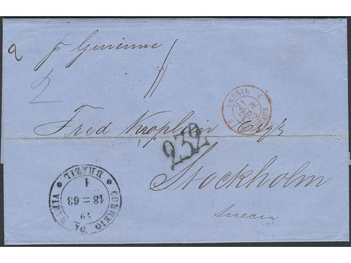 Sweden. Lösenförsändelser. Postage due mark 232 on 2-fold letter conveyed by steamer 'Guienne' from RIO DE JANEIRO 29.1.1863 to France, then sent via HAMBURG KSPA(D) to STOCKHOLM 1.TUR 27.2. Superb. Show less