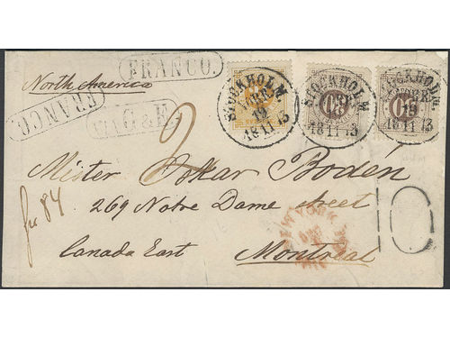Sweden. Facit 24d, 25d on cover, 24+2×30 öre on nice double rate cover front sent from STOCKHOLM 19.11.1873 to Canada, with the scarce routing mark VIA G&E (P: 10000). Only recorded mail with this rate. Certificate HOW 2 (3,3,4) (3,3,4) 2 (2012). EXHIBITION item. Ex. Feldman 1992 (CHF 3450). Show less