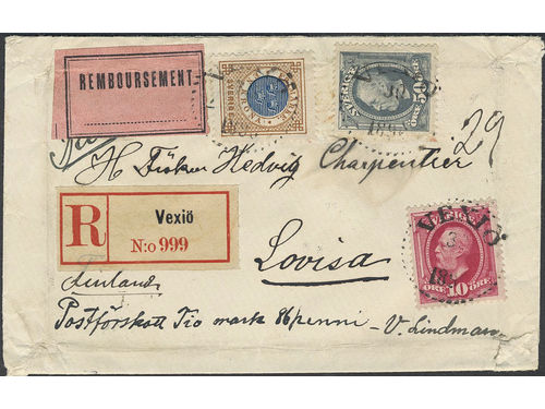 Sweden. Facit 49, 54, 59 on cover, 10+50 öre + 1 kr on registered cash on delivery cover sent from VEXIÖ 30.1.1895 to Finland. Very scarce, one of the earliest UPU Remboursement mail from Sweden to any foreign country. Show less