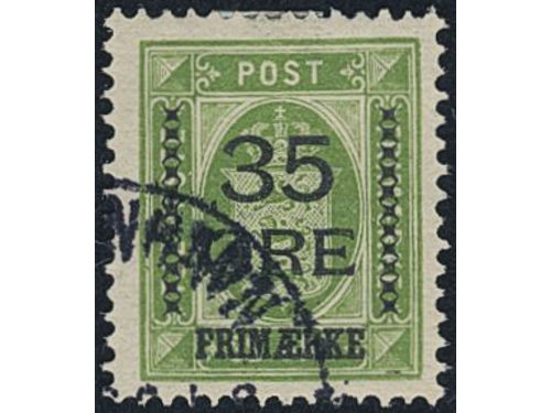 Denmark. Facit 122a used, 1912 Surcharge on Official stamps 35 / 32 øre yellow-green. Very fine copy. SEK 14000