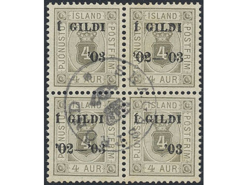Iceland. Official Facit Tj22 used, 1902 Overprint Í GILDI '02-'03 4 aur grey, perf 12¾. Part of overprint 02-03 missing on two stamps in this block of 4. Not mentioned in Facit or AFA. Show less