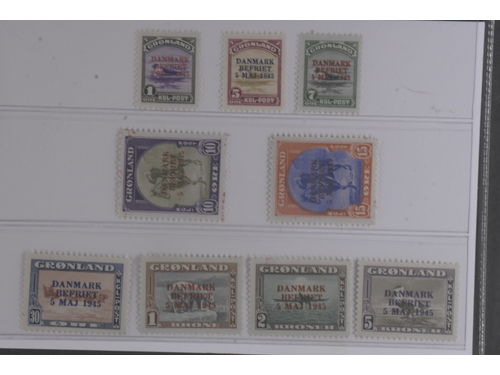 Greenland. Collection ★★/★/⊙ 1905–2003 in Leuchtturm album with stamp mounts. Very well filled with complete Pakke-Porto, 'Danmark Befriet' mint and wrong overprint colours NH. Later issues with high completion with mostly NH but some used or hinged are mixed in. Beware P2 have a strong fold. Low reserve. Viewing is recommended. Please see a selection of scans at www.philea.se. Mostly good quality. (400+) Show less