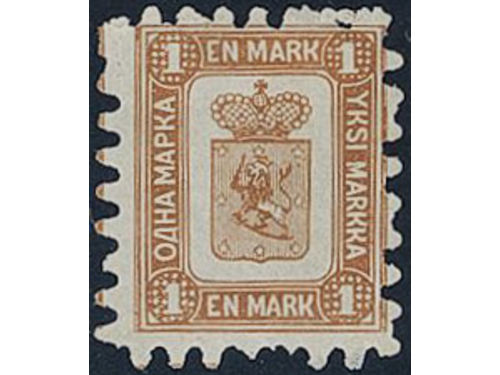 Finland. Facit 10 (★), 1867 Coat-of-Arms Finnish values 1 Mk brown. No gum and a few irregular perfs. SEK 20000 for *