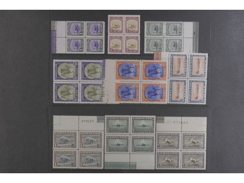 Greenland. Facit 10–18 ★★, 1945 Various designs. Complete set (9) in blocks-of-four mostly with side margins. SEK 12000