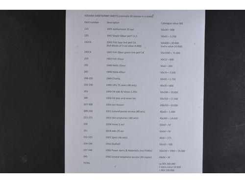 Iceland. ★★. Lot sheets and part sheets from the 1940s and 1950s including many better stamps and sets, all in very fine condition. See list with exact details of all stamps included. Facit over SEK 200 000. Show less