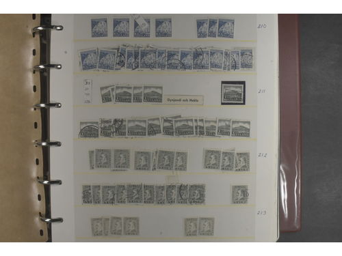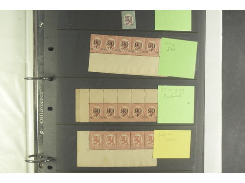 Finland. ★/⊙. An extraordinary range, very complex and scholarly even for the more experienced student of these issues, specifically for the first lion definitives of 1919 to 1929, all housed in four volumes with 1000s of stamps with countless varieties, unusual postmarks, lots of multiples, superb imprint blocks of six with the month and year of printing to determine the different papers, etc, etc. Much of this is a 'work in progress', as this collector expanded over a 40 year period of serious buying anything he could find. especially material that was different to the norm. It is because of this that while there are many pages of album leaves, there are also many more pages for the multiples housed in large stockcards, often written up accordingly to identify the stamps. Almost an impossible lot to describe as it is so in depth - anybody who is interested in this area of Finnish philately will be absolutely delighted in the breadth and scope of what is here. The viewing could take hours just to begin to appreciate this amazing holding. Approx. 6 kg. Show less