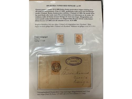 Finland. Miscellaneous, 1891–1917 in album. 'Farewell to the Finnish Coat of Arms'/ 'Farväl till Finlands Vapen', 1892, 1900, 1901. Nicely mounted with descriptive text. Please see a selection of scans at www.philea.se + an album with postage due covers (including several photo copies). Show less