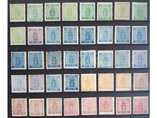 Sweden. Collection ★/(★) COAT-OF-ARMS. All denominations represented incl. many different shades, also better – 18 stamps with opionions (shades) by O.P. Also some with varieties, e.g. screw impressions / incurvations. Somewhat mixed quality, but also several fine, well centered stamps. Very high catalogue value. Please inspect. (40). Show less