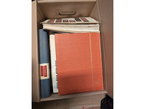 Sweden. Accumulation ★★/★/⊙ 1870s–2010 in box. Mystery box with a huge pile of album leaves and visir leaves mostly Coilstamps - 1960s. One album vending machine booklets, 2 stockbooks and 2 other albums with a mix of Sweden old-1950s. One envelope with more modern Face value incl. 46 "Brev" and 10 "Christmas" stamps. Interesting lot. Somewhat mixed quality. Approx. 18 kg. (1000s) Show less