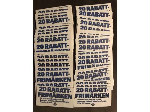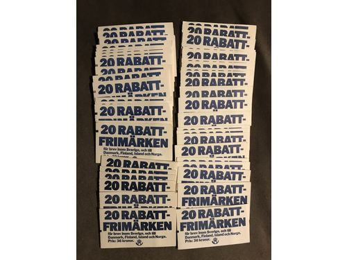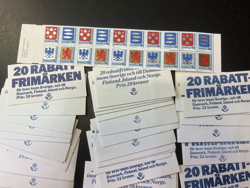 Sweden. Discount stamp booklets, lot 1979–1990 in envelopes. Discount stamps mostly loose some in booklets. 1979–1980 ×110, 1981–1990 ×460. Show less