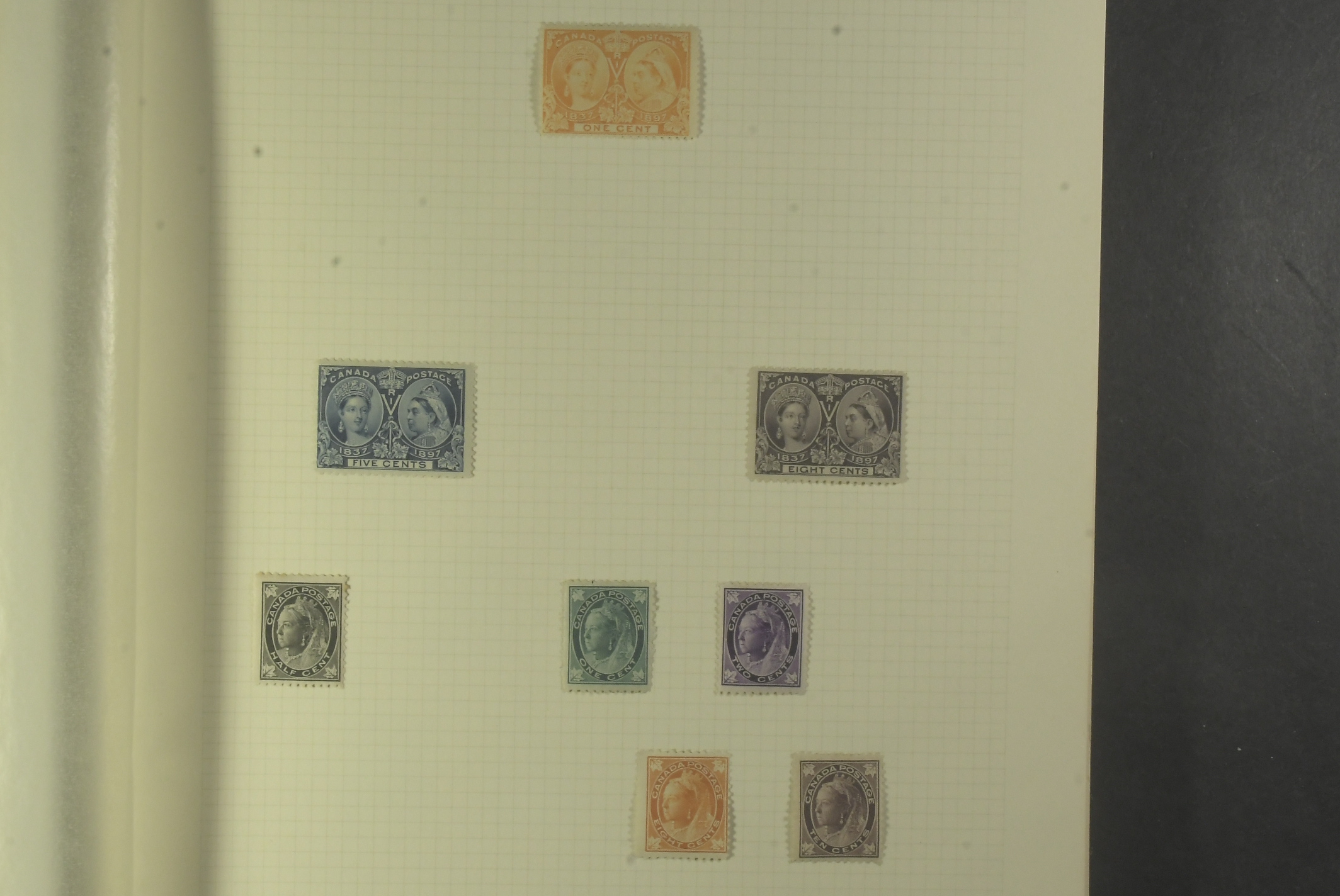 Canada. ★/⊙. Attractive collection, mint and used, housed in a well-filled Exeter album on quadrille album leaves with several 100s of stamps, all one a kind. Highlights include a study of the first beaver cents issues to 17 cents Cartier, then follows small and large heads, the former with different shades on the 15cents and the latter with many distinct shades to the 10 cents. Also also the widow weaves 20 and 50 cents complete, the four leaves mint QV inc. high values 8 and 10 cents with rich colours SG148/9 (min. Cat. £200) and then various range of the Jubilee issues through to EDVII A good study of the KGV Admiral heads to $1, many useful commems with for example $1 Mount Cavell, then seldom seen per-fins back of the book, OHMS to $1 inc 50 cents and dollar etc SG087/0107 (cat. £550) and virtually everything else KGVI and then onto QEII, ending with large classic registered inc. shades, further OHMS per-fins G o/ps inc. $1 Abegweit and much more. Collection offered intact as received, will catalogue several thousands of pounds, a very pleasant viewing.