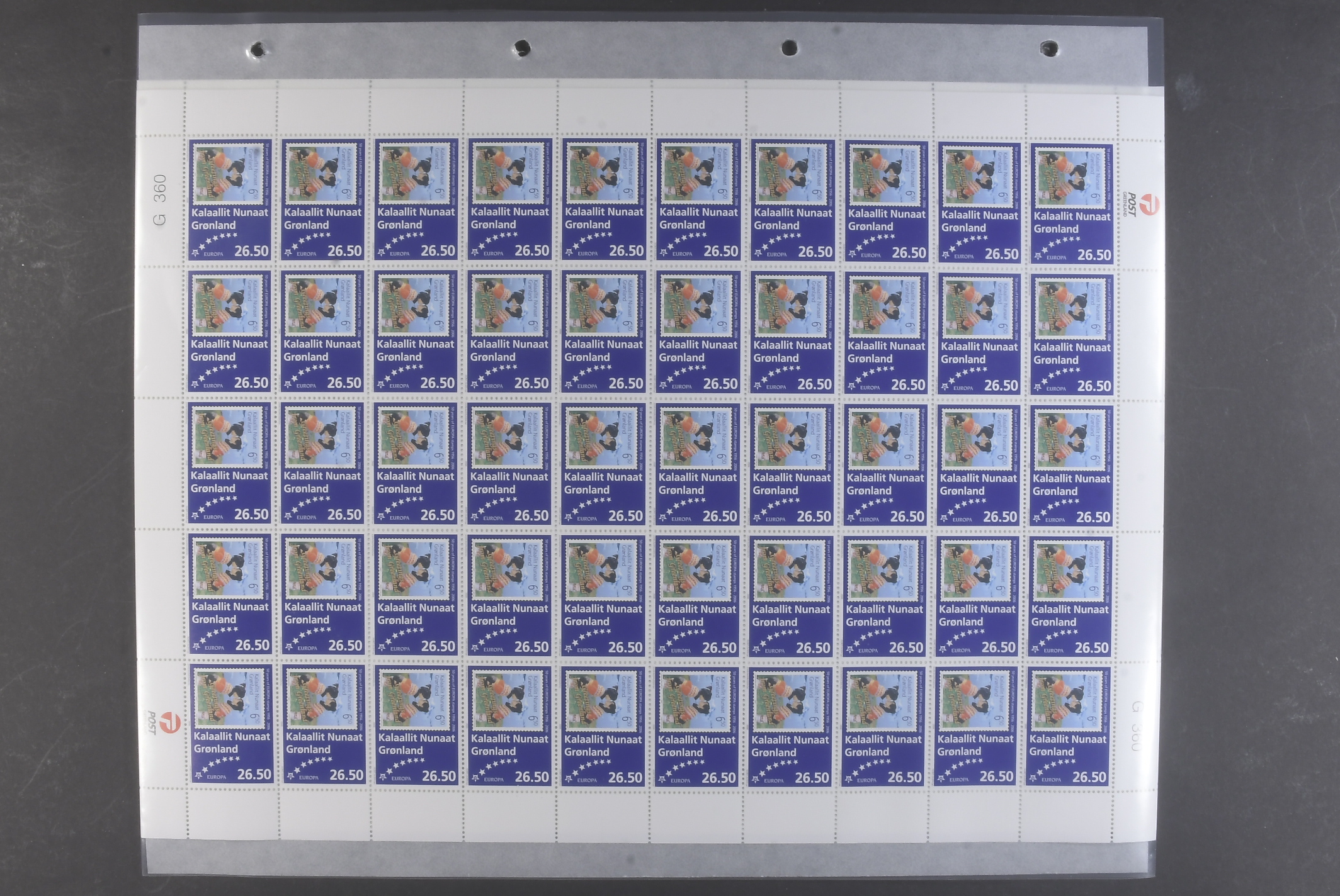 Greenland. Facit 448 ★★, 2006 50th anniversary of Europa stamps 26.50 kr (1). Lot with 20 full sheets of fifty stamps. Face value DKK 26500.