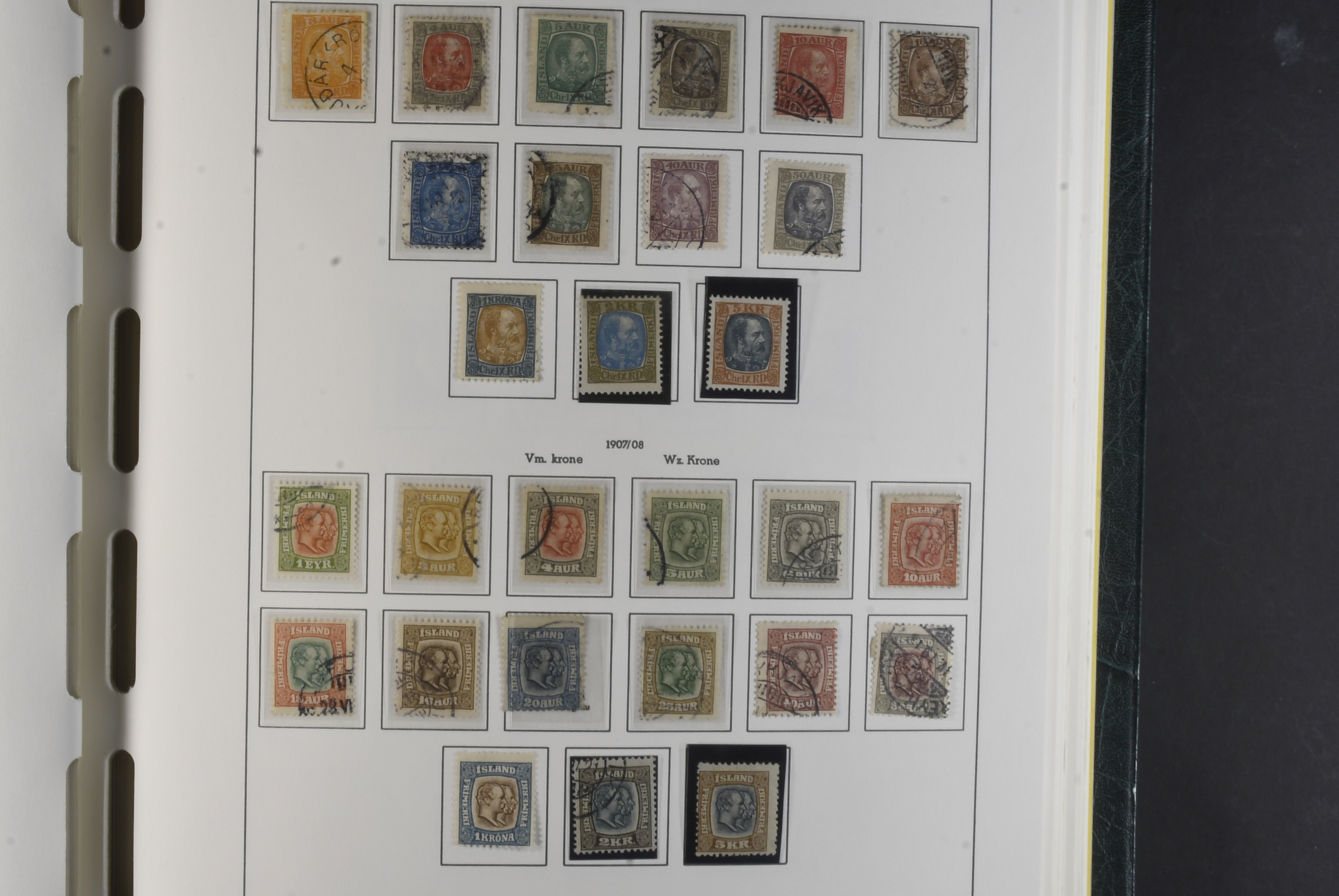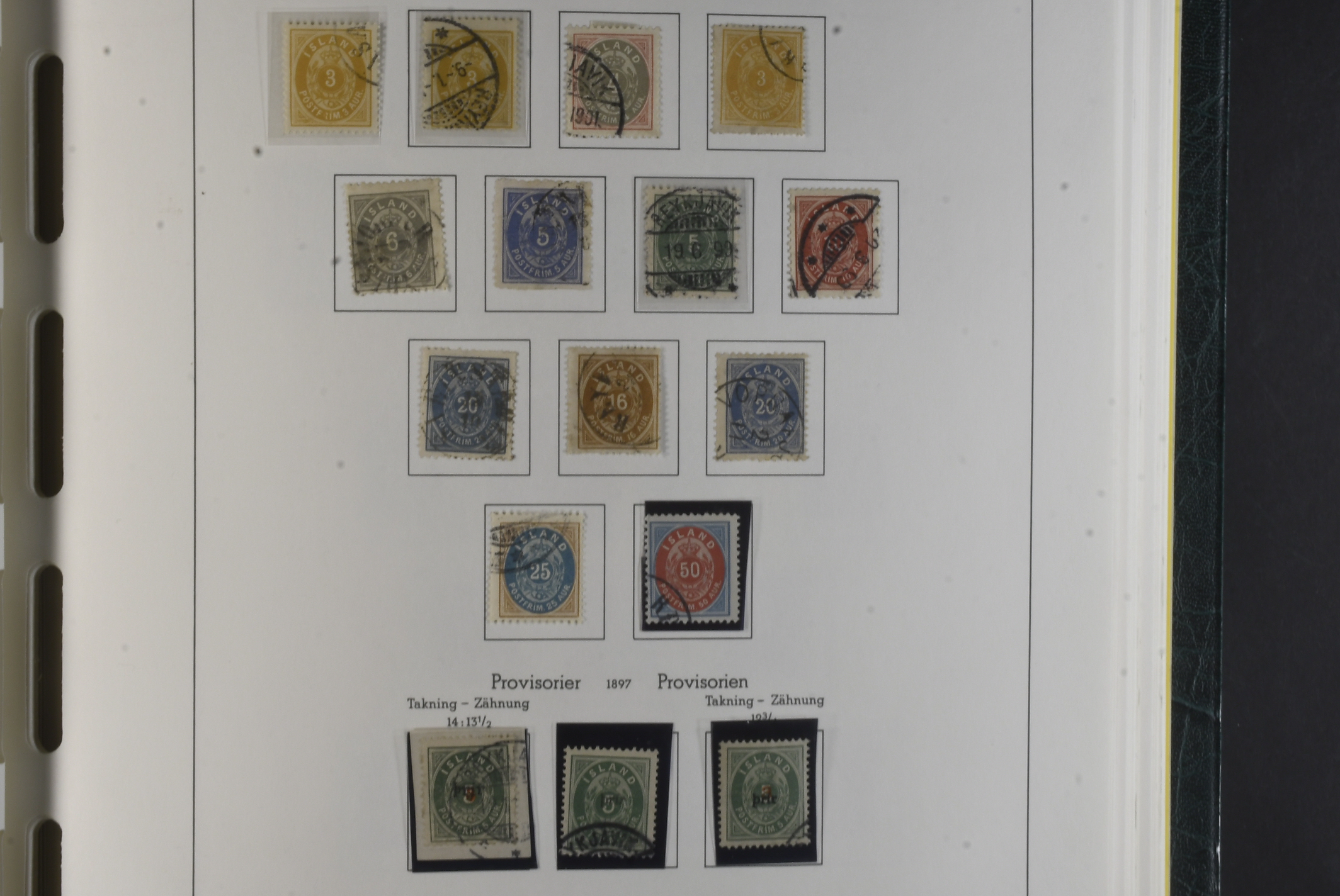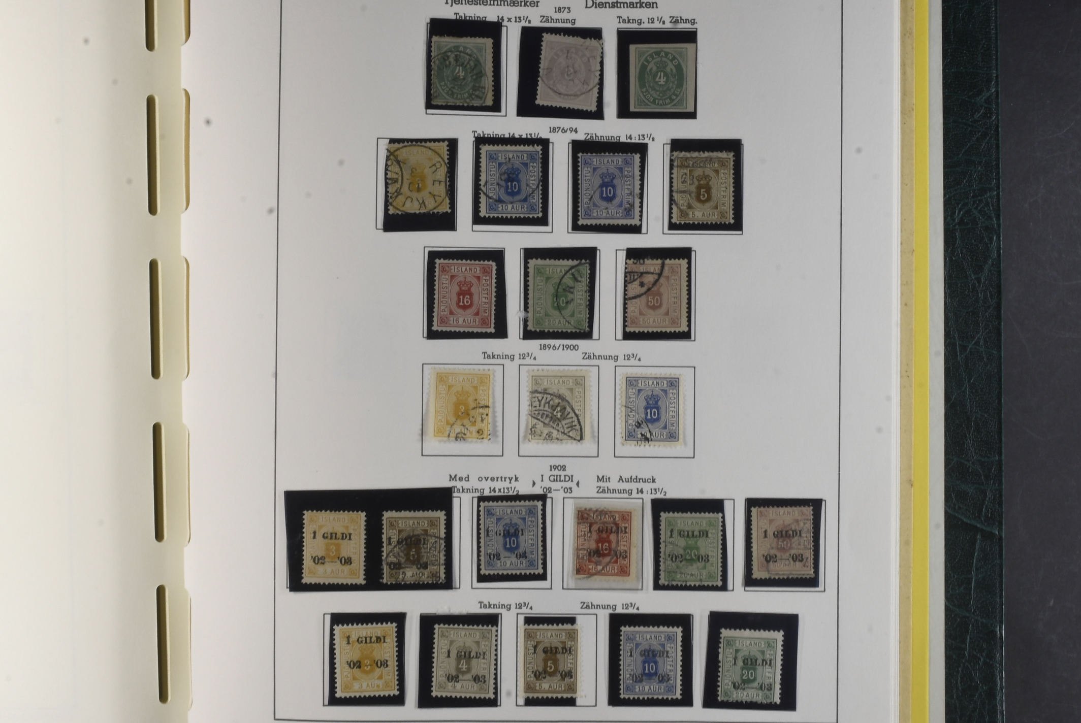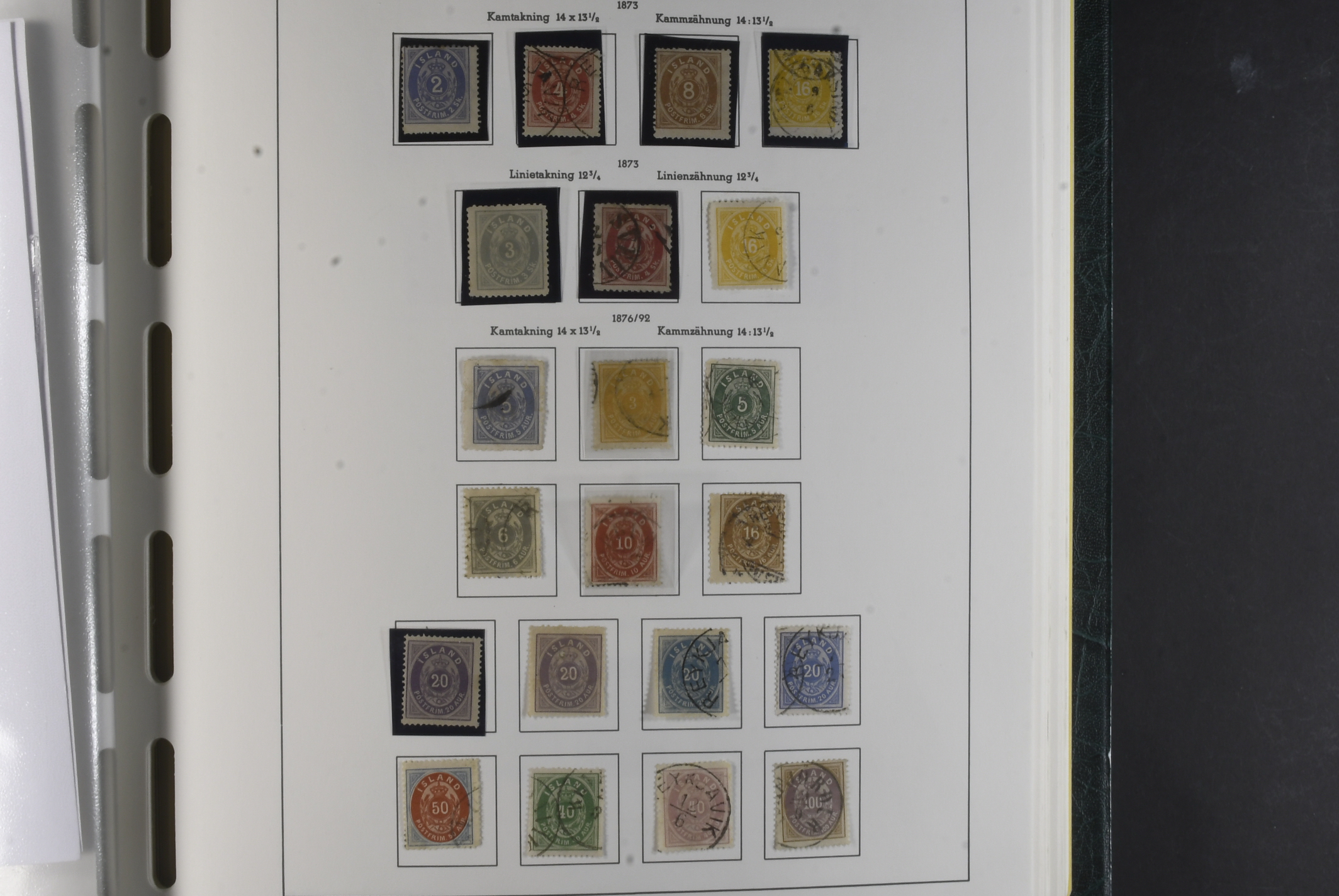 Iceland. Collection mostly used 1873–1996 in Leuchtturm album. Almost complete collection, just missing a couple of þrir and the most expensive I gildi stamps. Quite mixed condition. 2 sk no gum, 8 sk no gum, 4 sk line perforation thin, includes 3 þrir stamps (36 with cert.) from Kings incl. Hopflu Itala (cert. Nielsen Mint) to late ca. 1990 complete in main numbers incl. officials except Fa1. Mixed mint and mostly used through the whole collection. Viewing is recommended the quality is rather mixed and several stamps have "Tollur" cancels. Somewhat mixed quality. (900+)