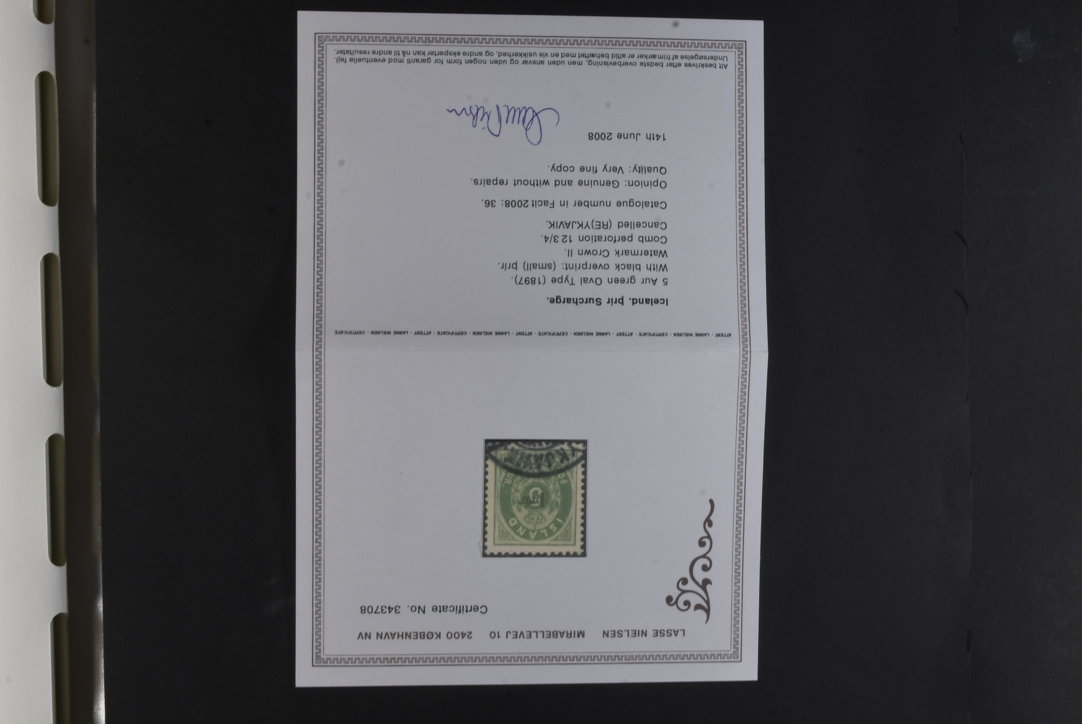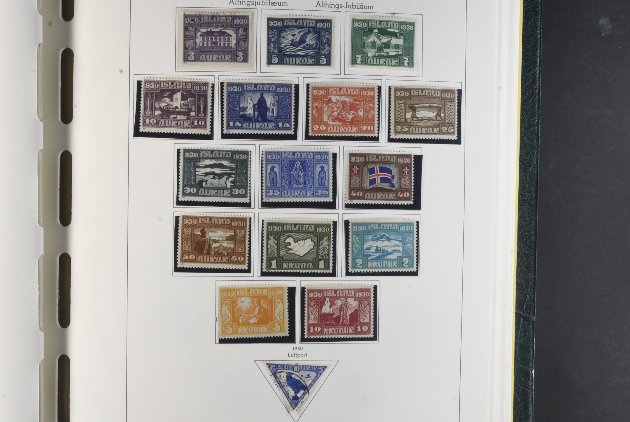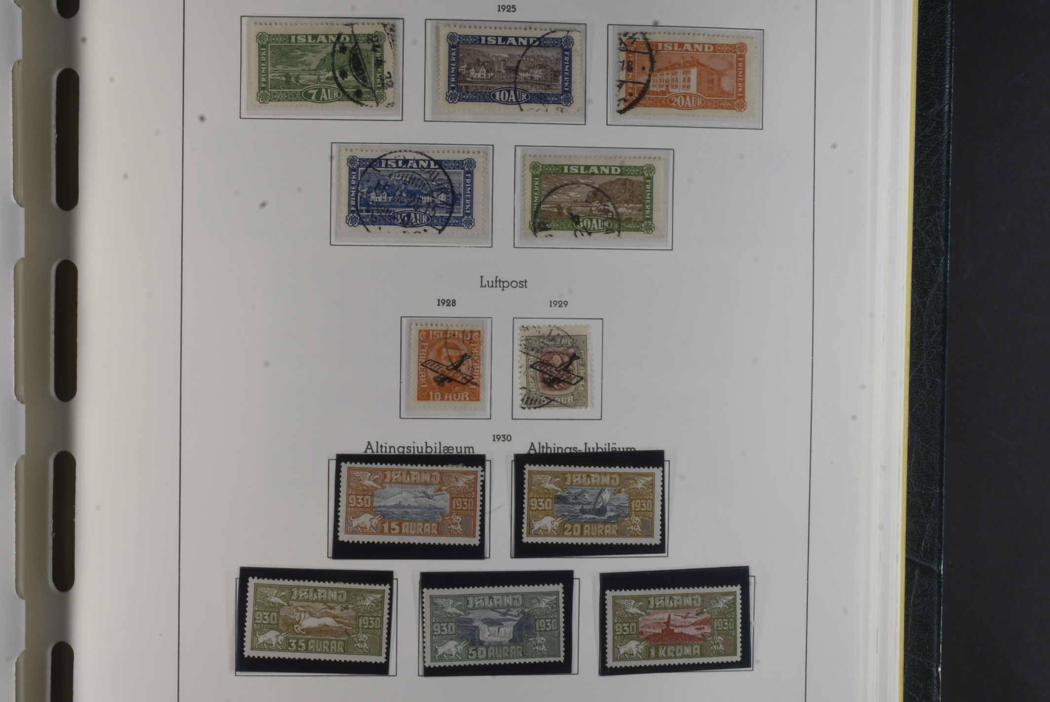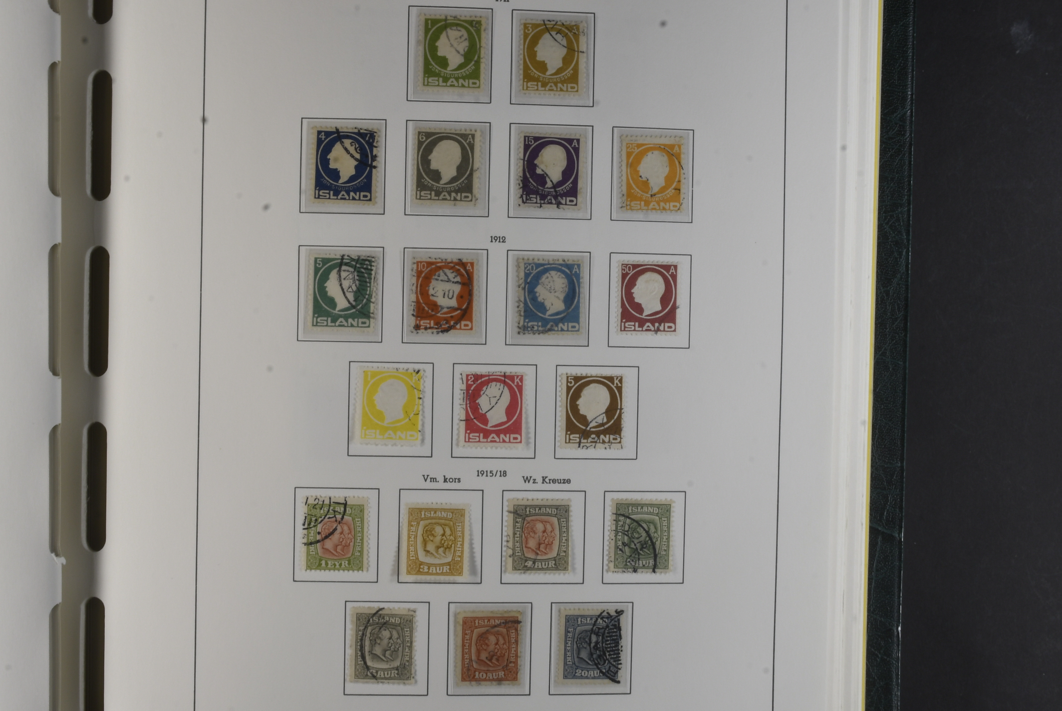 Iceland. Collection mostly used 1873–1996 in Leuchtturm album. Almost complete collection, just missing a couple of þrir and the most expensive I gildi stamps. Quite mixed condition. 2 sk no gum, 8 sk no gum, 4 sk line perforation thin, includes 3 þrir stamps (36 with cert.) from Kings incl. Hopflu Itala (cert. Nielsen Mint) to late ca. 1990 complete in main numbers incl. officials except Fa1. Mixed mint and mostly used through the whole collection. Viewing is recommended the quality is rather mixed and several stamps have "Tollur" cancels. Somewhat mixed quality. (900+)