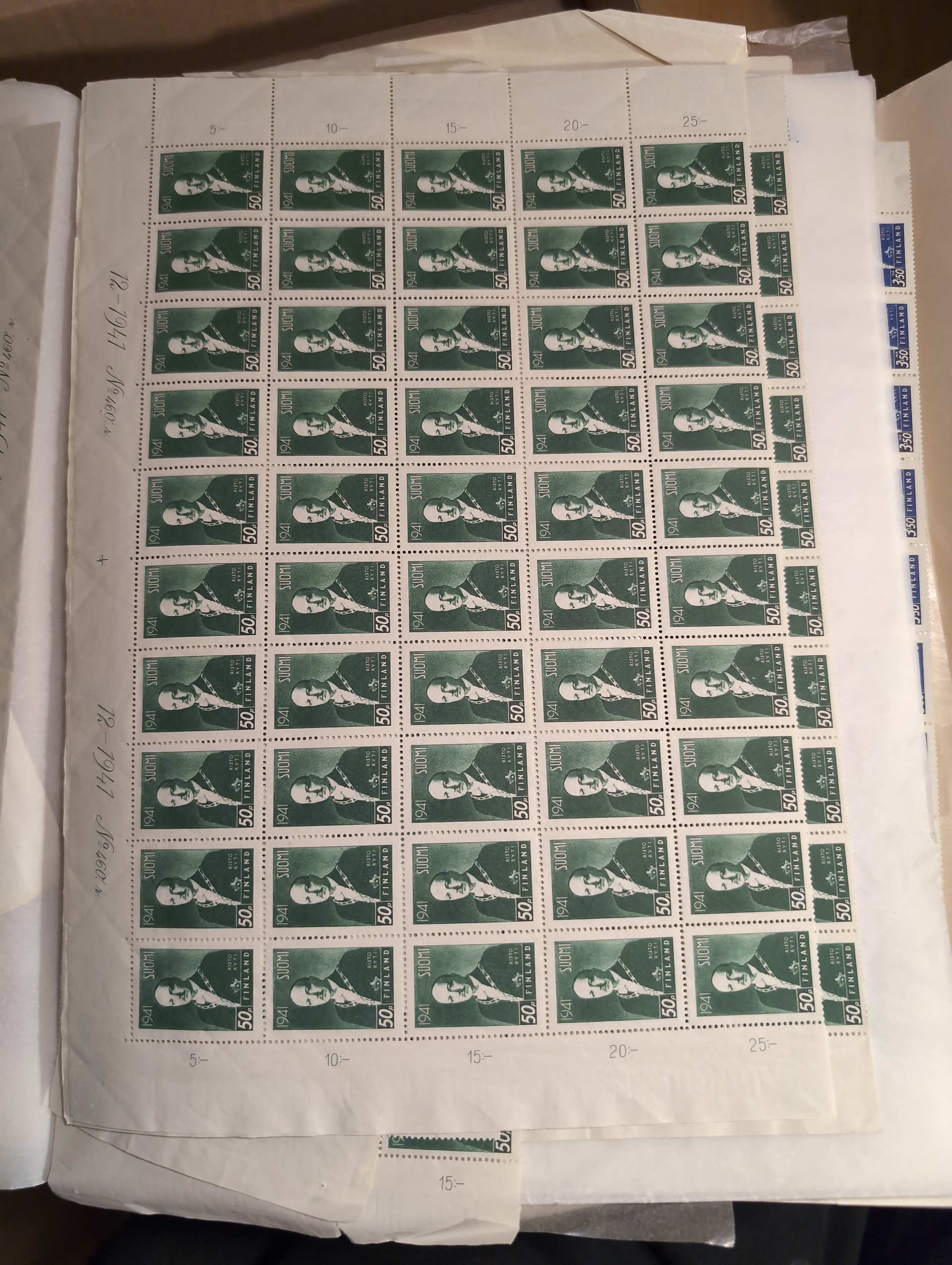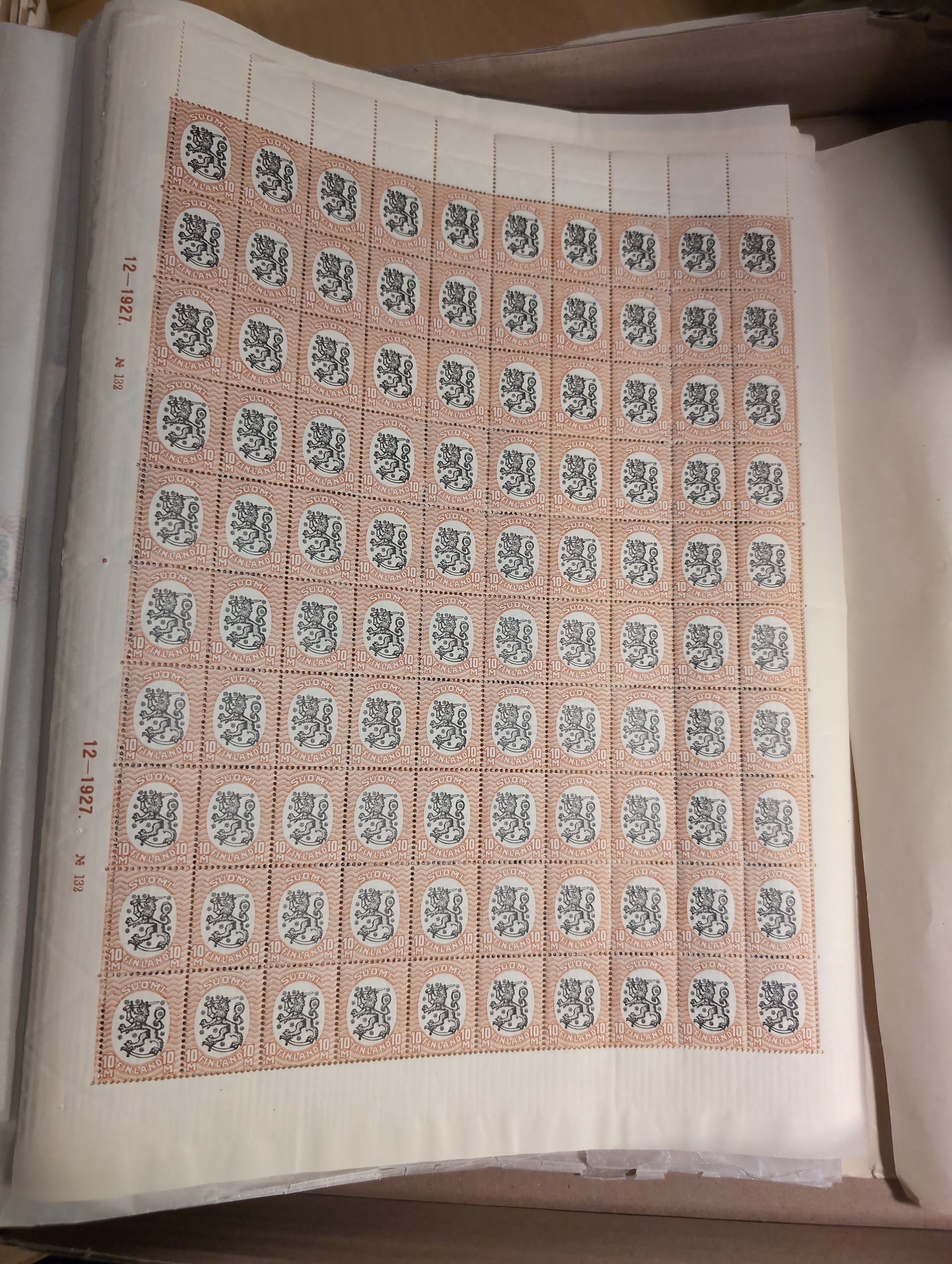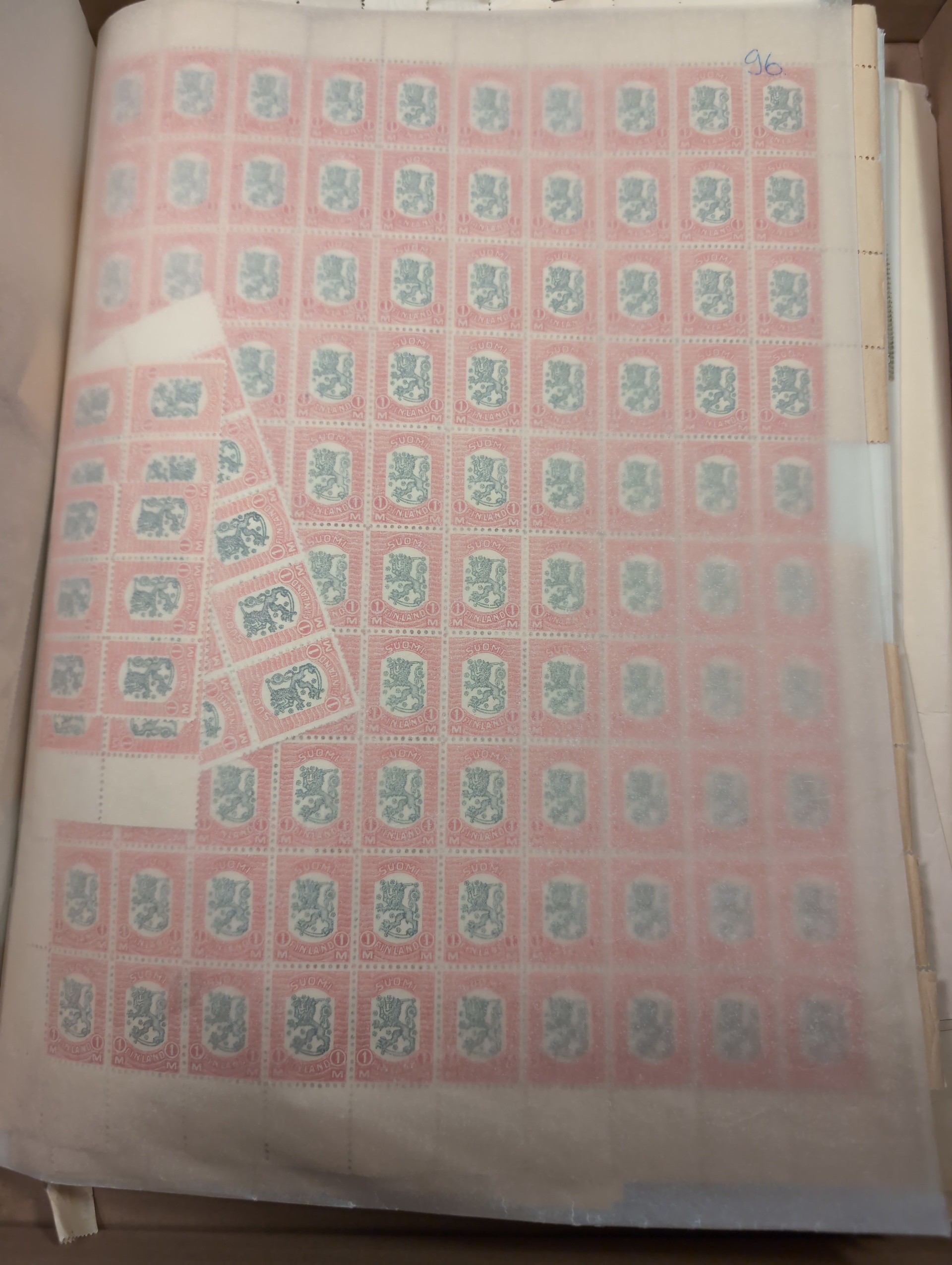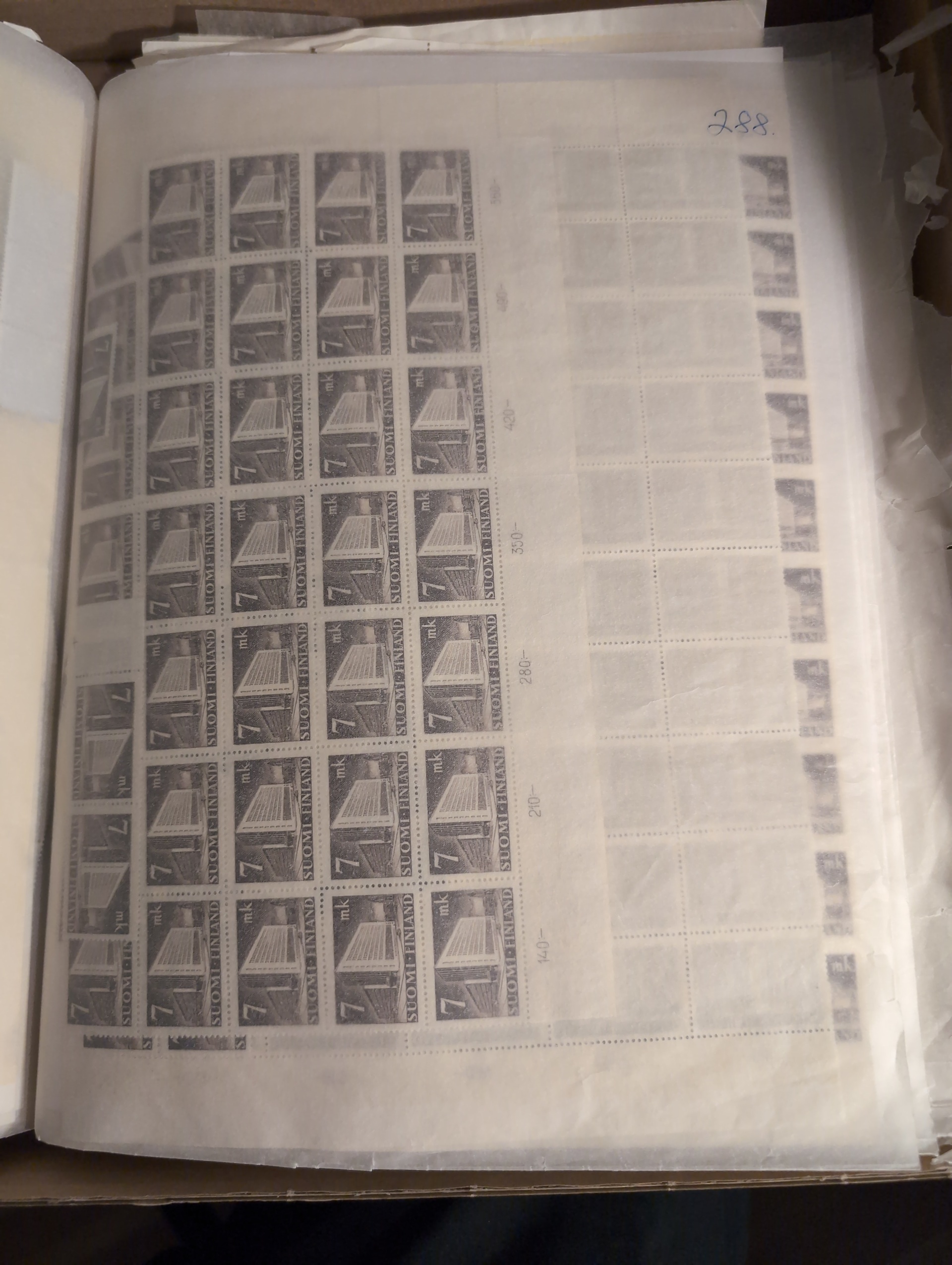 Finland. Accumulation ★★ 1889–1944 in box. Dealers stock of mint sheets and part of sheets Norma 35A//301 mostly cheaper stamps, with some better defenitives. from about 20-100s of each, better stamps are missing. Please see a selection of scans at www.philea.se. Mostly fine quality. Approx. 10 kg. (many 1000s)