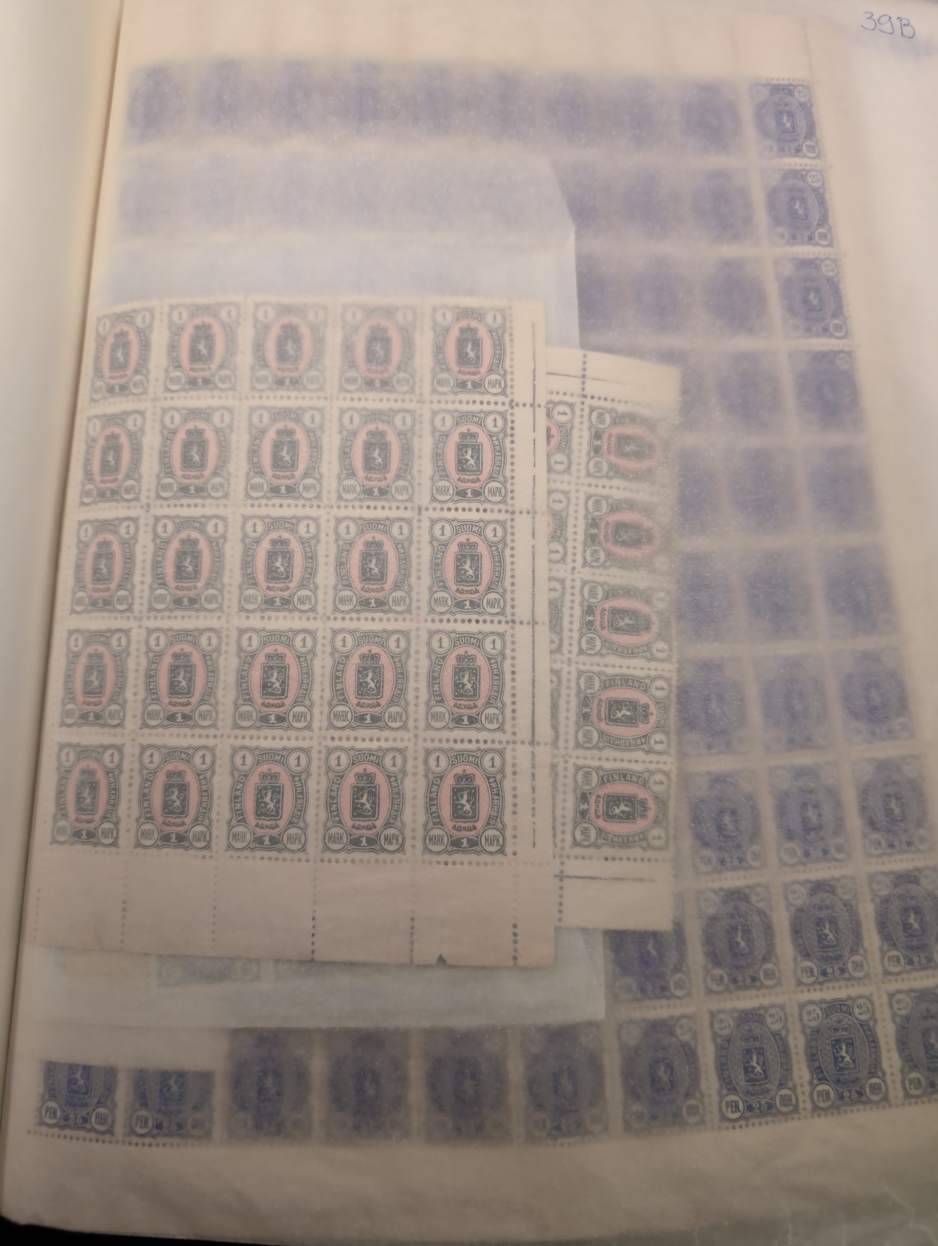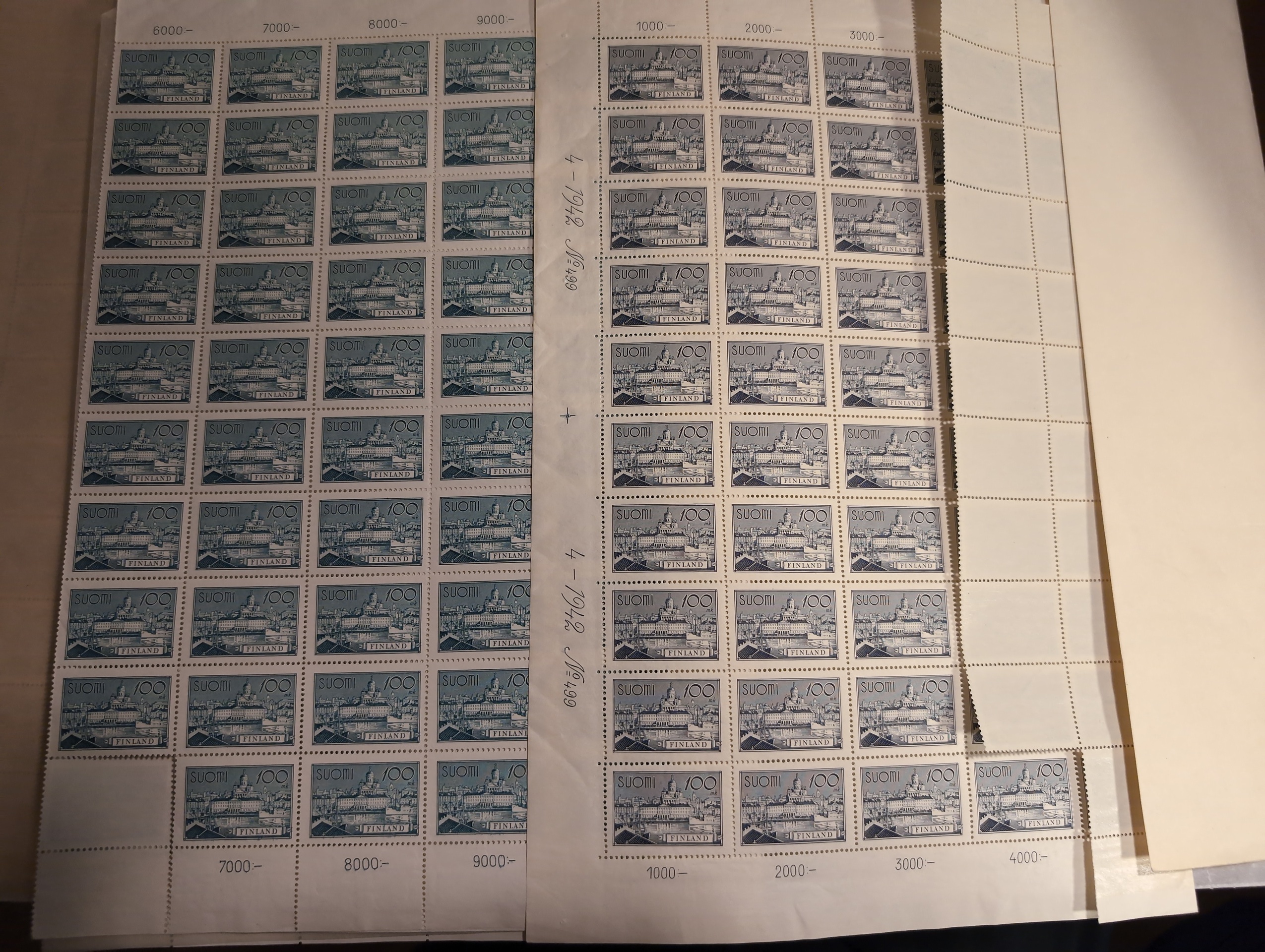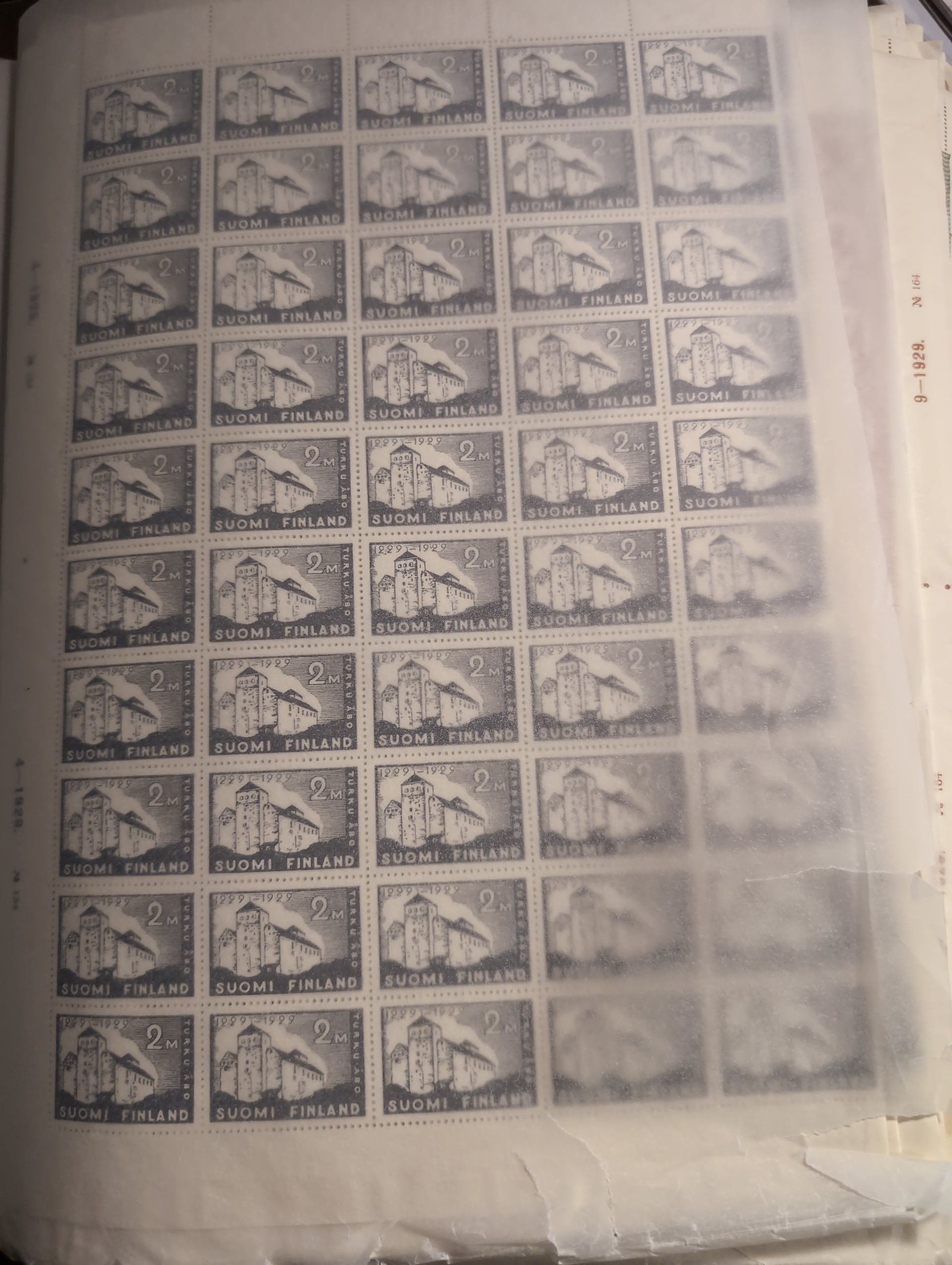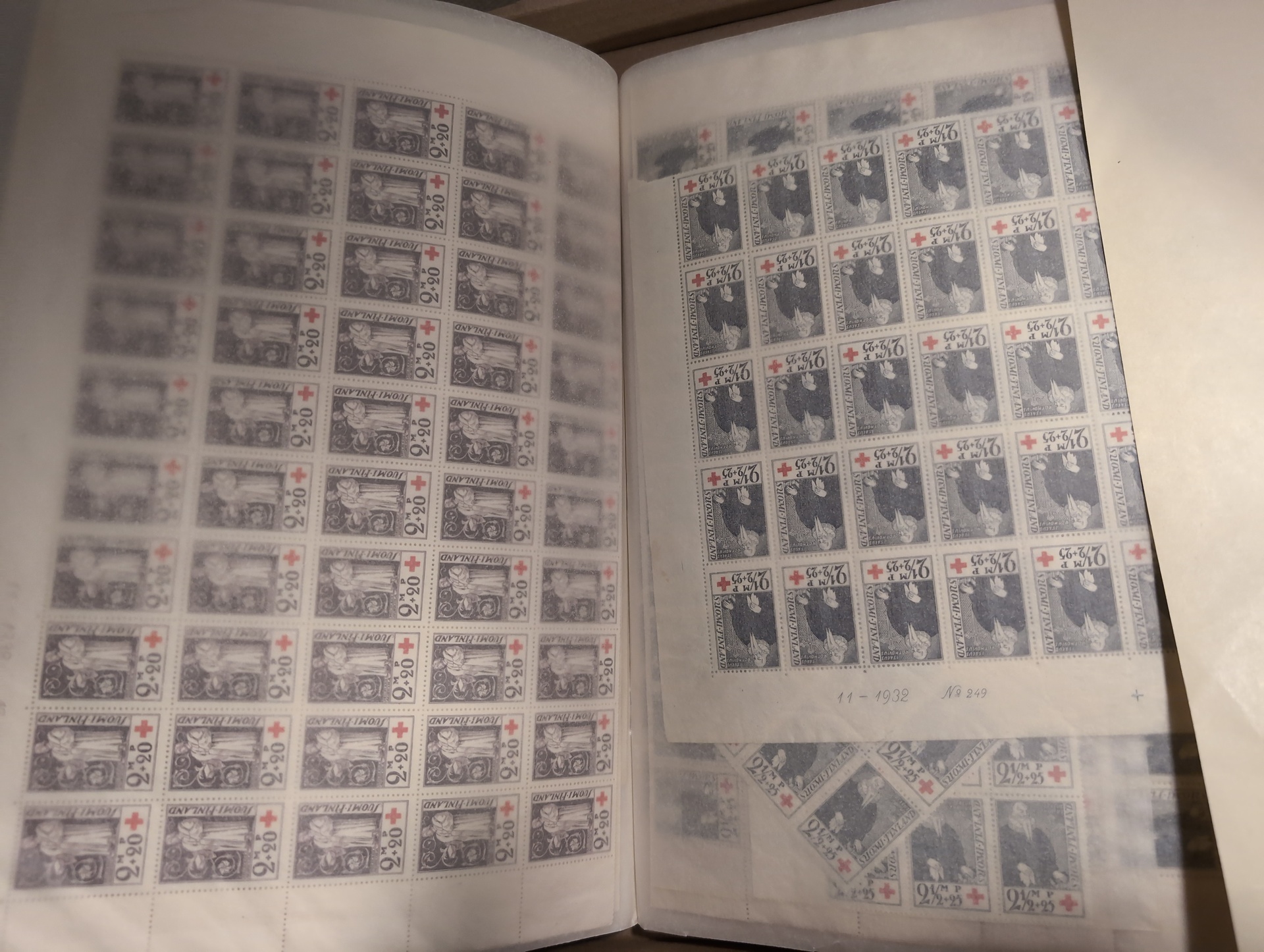 Finland. Accumulation ★★ 1889–1944 in box. Dealers stock of mint sheets and part of sheets Norma 35A//301 mostly cheaper stamps, with some better defenitives. from about 20-100s of each, better stamps are missing. Please see a selection of scans at www.philea.se. Mostly fine quality. Approx. 10 kg. (many 1000s)