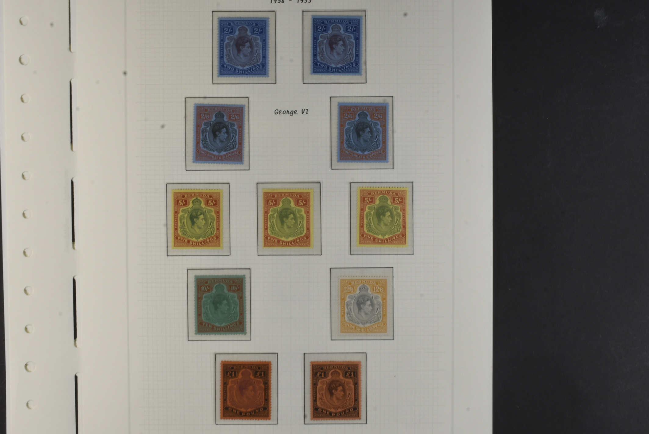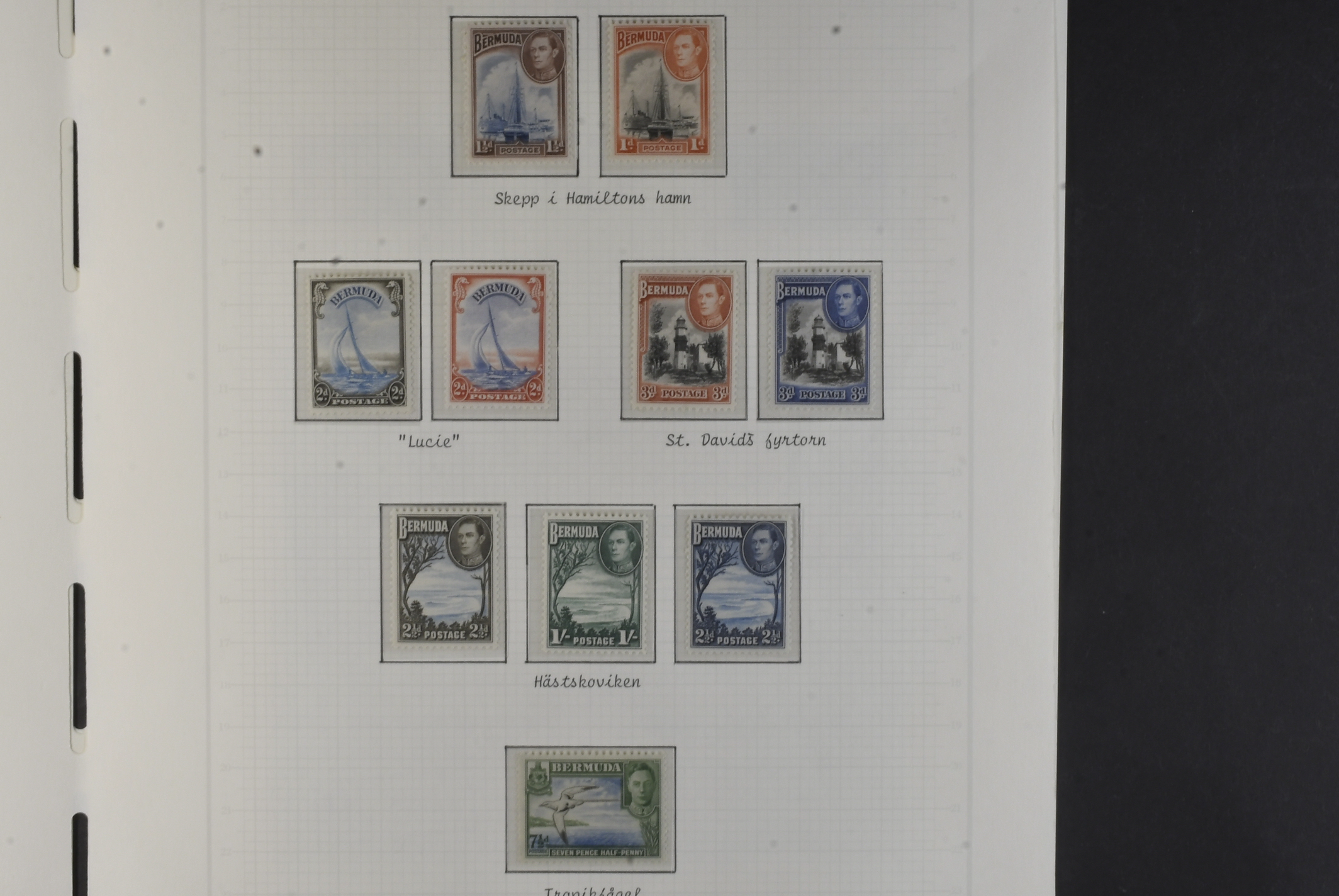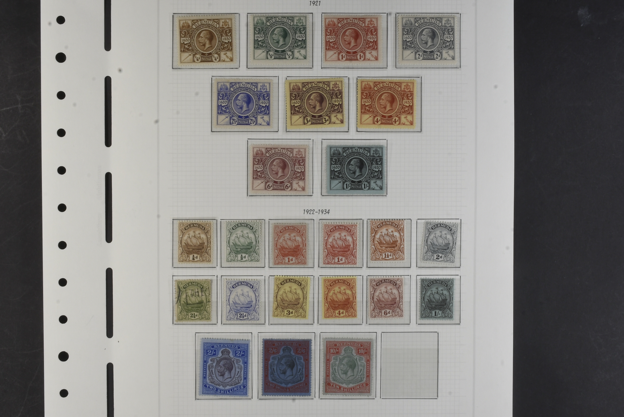 Bermuda. Collection mostly ★ 1921–1952 on leaves. KGV with 1921 set mh, 1922 up to 2s6d mh and 10s being no gum. 1936 complete lh, 1938–52 set complete with extra shades incl. extra £1. Please see a selection of scans at www.philea.se. Fine quality. (60)