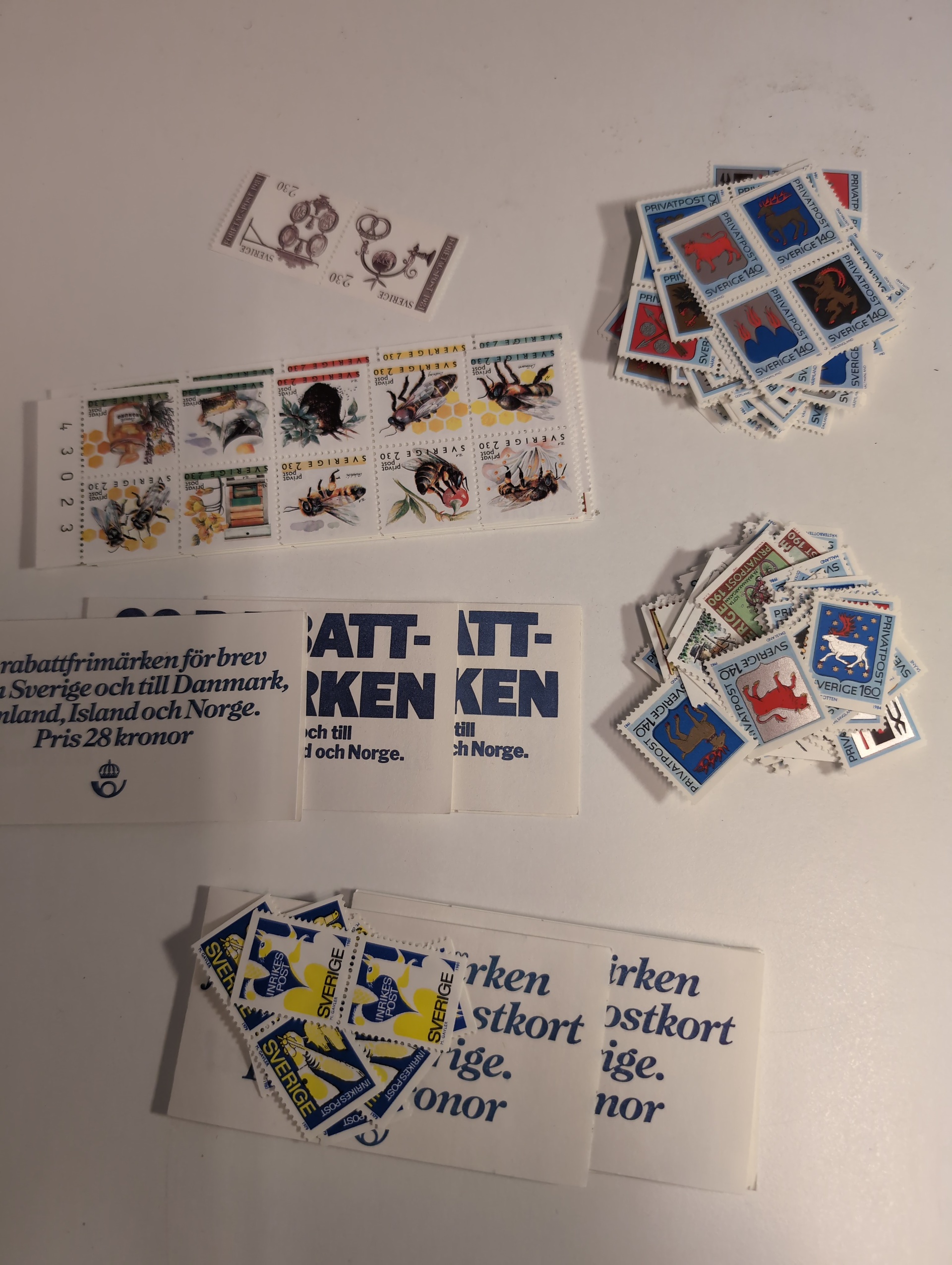 Sweden. Discount stamp booklets, lot 1979–1990 in envelopes. Discount stamps mostly loose some in booklets. 1979–1980 ×110, 1981–1990 ×460.