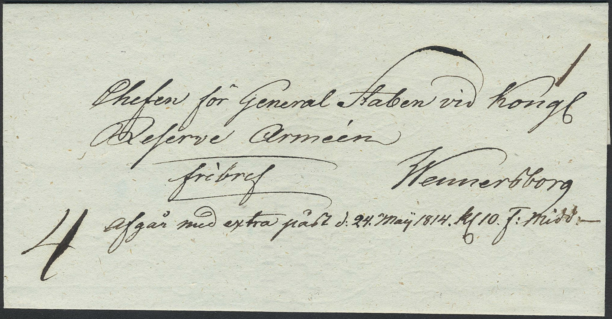 Sweden. Military prephilately. Cover with notation 'afgår med extra påst d: 24.maÿ 1814. kl 10 f:midd', sent to Vänersborg.