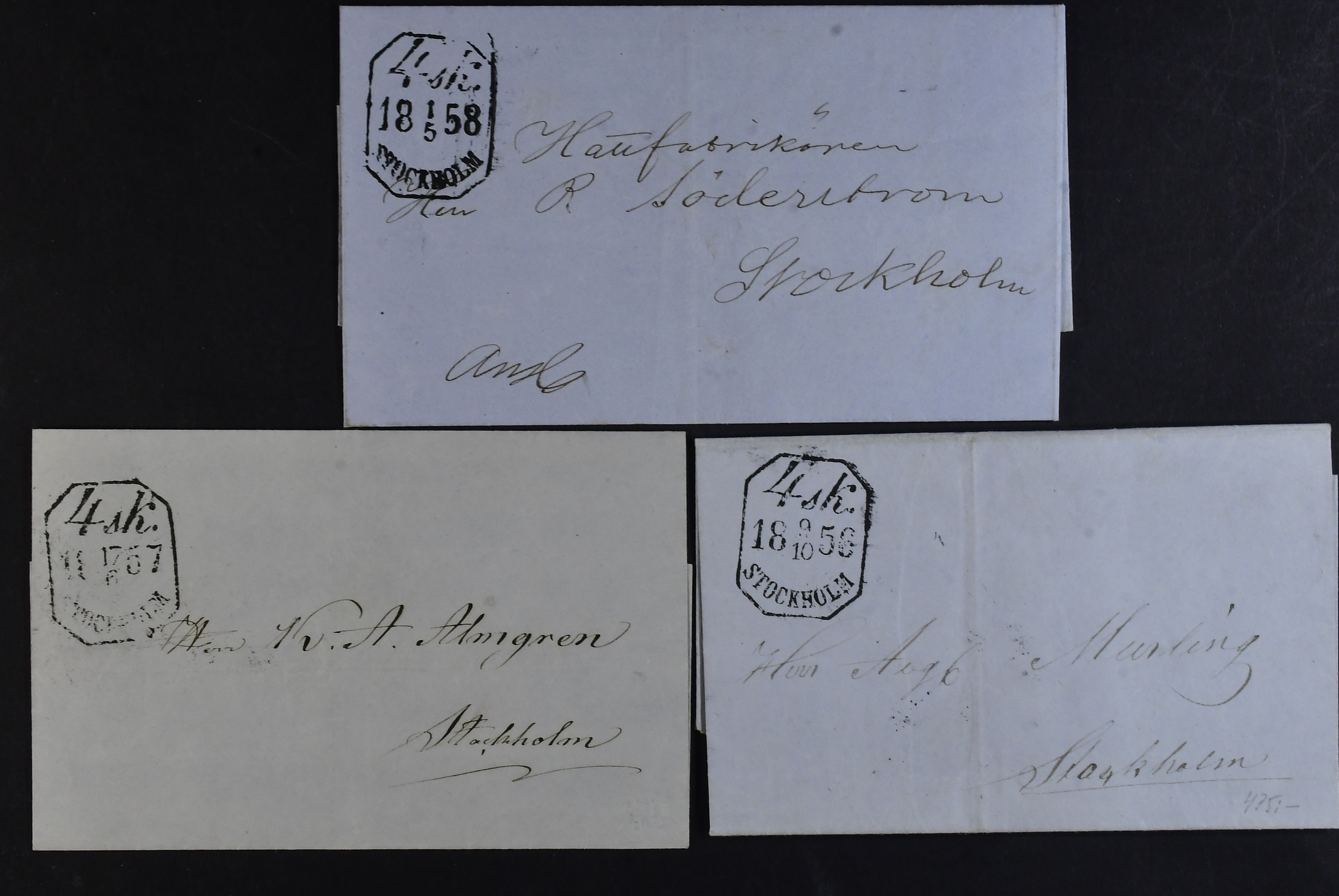 Sweden. Lösenförsändelser. 4 sk. STOCKHOLM (type 2) on two letters dated 'Sundsvall 8.10.1856' and 'Upsala 1.5.1858', respectively, plus one cover with arrival note only. (3). Postal: 2400:-