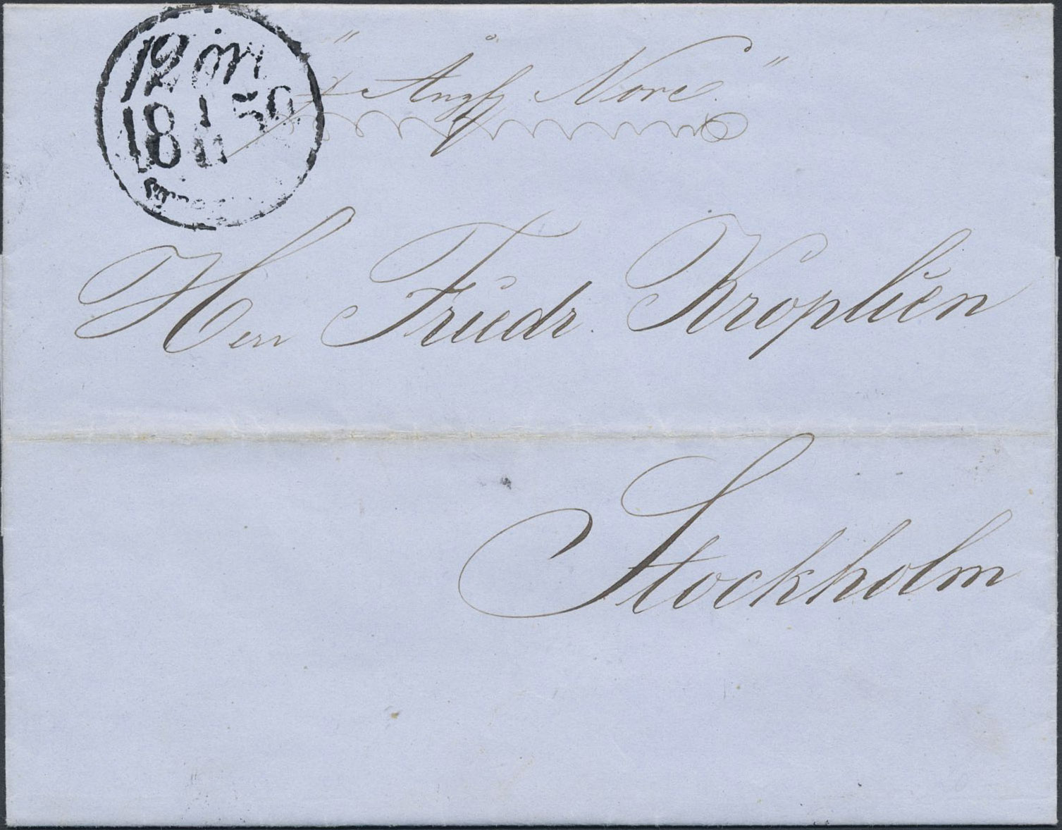 Sweden. Lösenförsändelser. 12 öre STOCKHOLM 1.11.1856 on letter dated 'Norrköping d. 31 October 1859' with ship notation 'p Ångf Nore'.