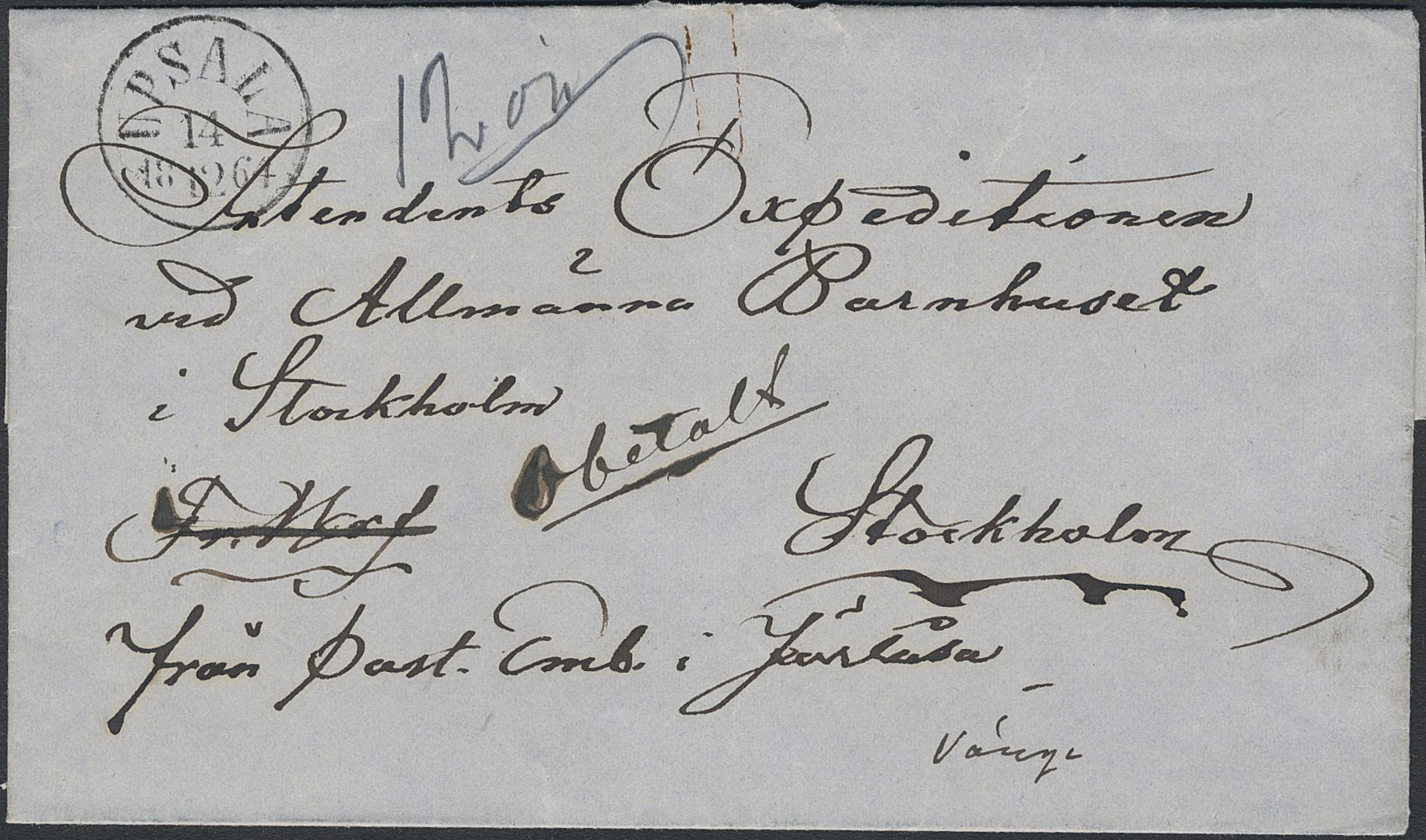 Sweden. Lösenförsändelser. Interesting cover, first endorsed 'Fr.Bref', then changed to 'Obetalt', and sent to UPSALA 14.12.1864 to Stockholm. Postage due notation '12 öre'.