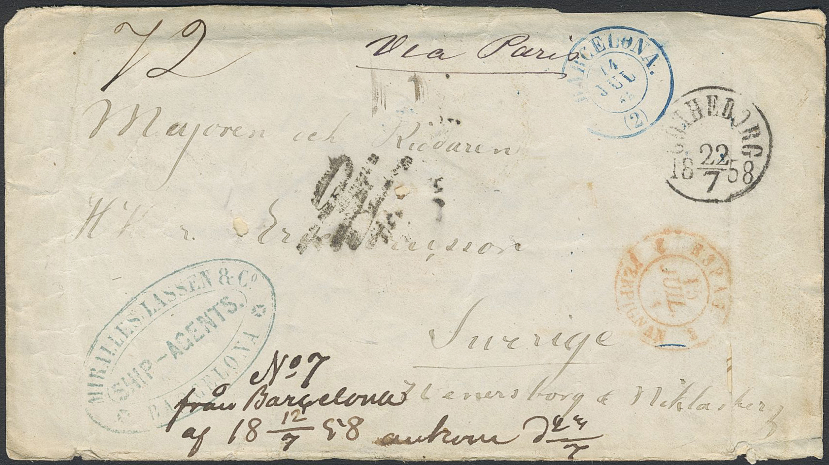 Sweden. Lösenförsändelser. Postage due mark 24 Sk on cover with full content sent from BARCELONA 14.JUL.58 via MARSEILLE A PARIS 16.JUIL.58 to GÖTHEBORG 22.7.1858. Oval cancel SHIP-AGENTS MIRRALES LASSEN & Co. BARCELONA. The cover with a few small holes and with the upper back flap missing.