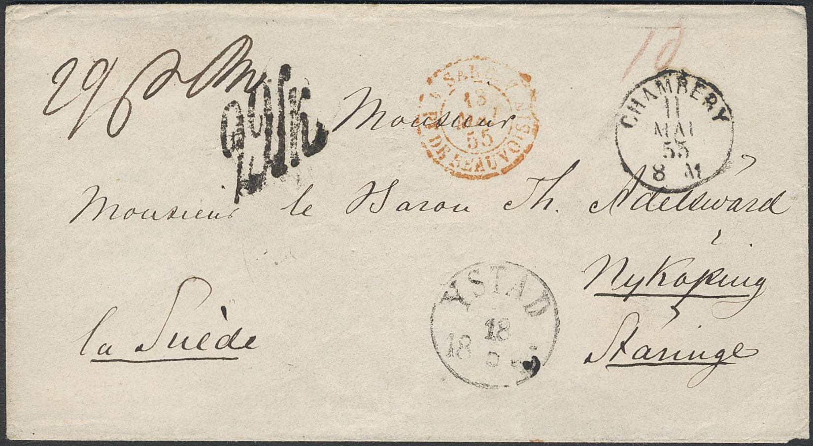 Sweden. Lösenförsändelser. 29 Sk on cover sent from CHAMBERY 11.MAI.55, Sardinia, via KS&NPA HAMBURG 15.5.1855 and YSTAD 18.5.1855 to Nyköping. Postal: 3000:-