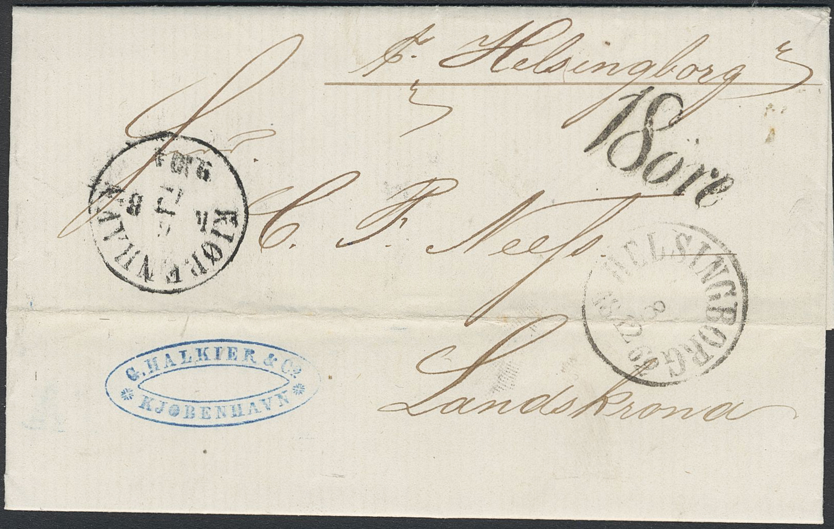 Sweden. Lösenförsändelser. Postage due mark 18 öre on letter sent from KIØBENHAVN K B 6.12 'pr Helsingborg' to HELSINGBORG 8.12.1862 and then to Landskrona. Superb.