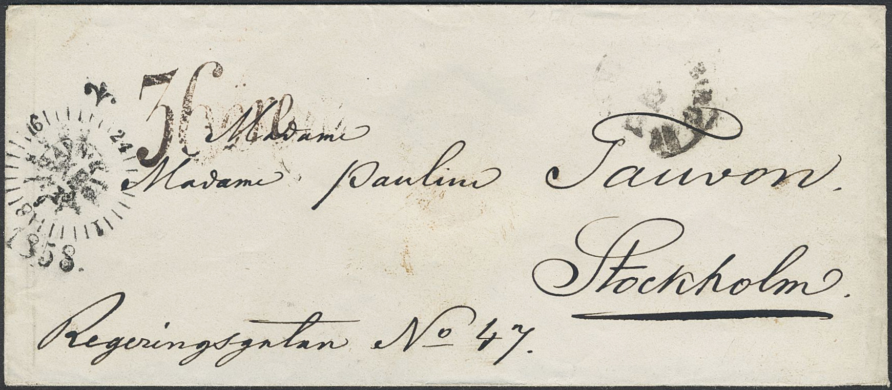 Sweden. Lösenförsändelser. Postage due mark 36 öre in red-black cover on cover sent from Copenhagen with compass mark, via HELSINGBORG 22.11.1858 to Stockholm.