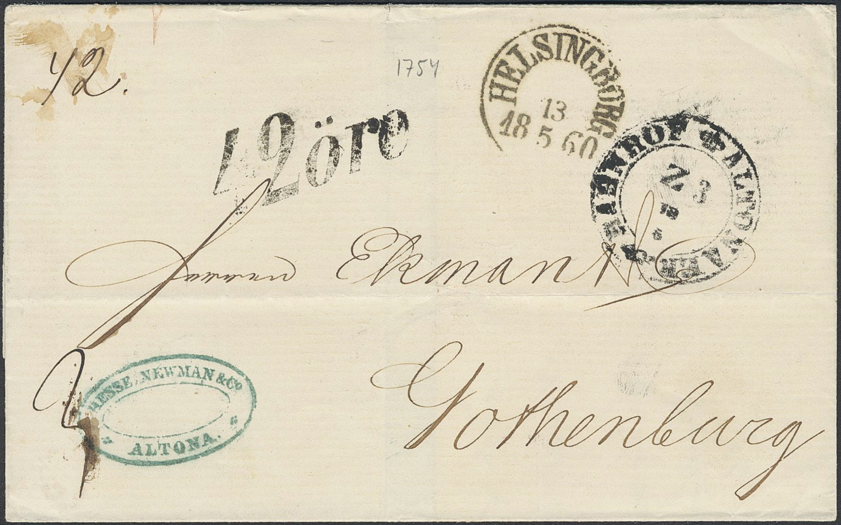 Sweden. Lösenförsändelser. Postage due mark 42 öre on cover sent from ALTONA BAHNHOF Z 3 12.5, Holstein, via HELSINGBORG 13.5.1860 to Gothenburg.