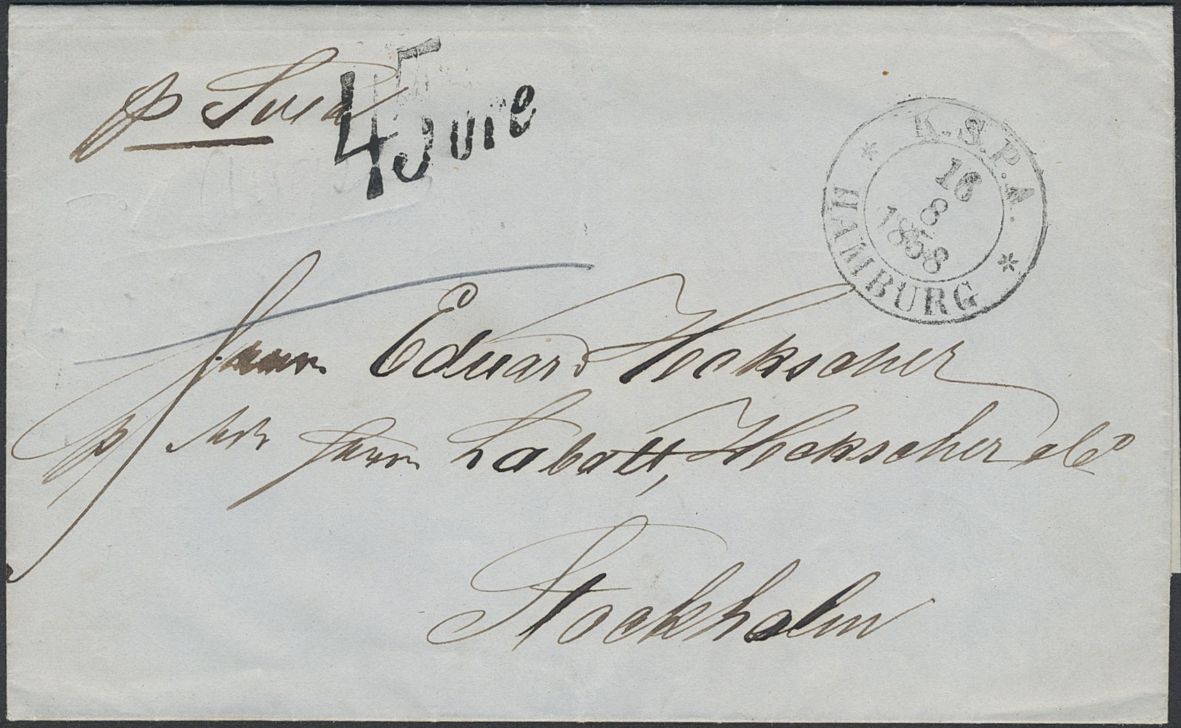Sweden. Lösenförsändelser. Postage due mark 45 öre on letter sent from K.S.P.A. HAMBURG 16.8.1858 'p Svea' to STOCKHOLM.