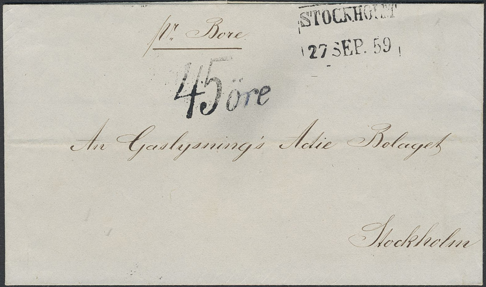 Sweden. Lösenförsändelser. Postage due mark 45 öre on cover conveyed 'pr Bore' to STOCKHOLM 27.SEP.59. Superb.