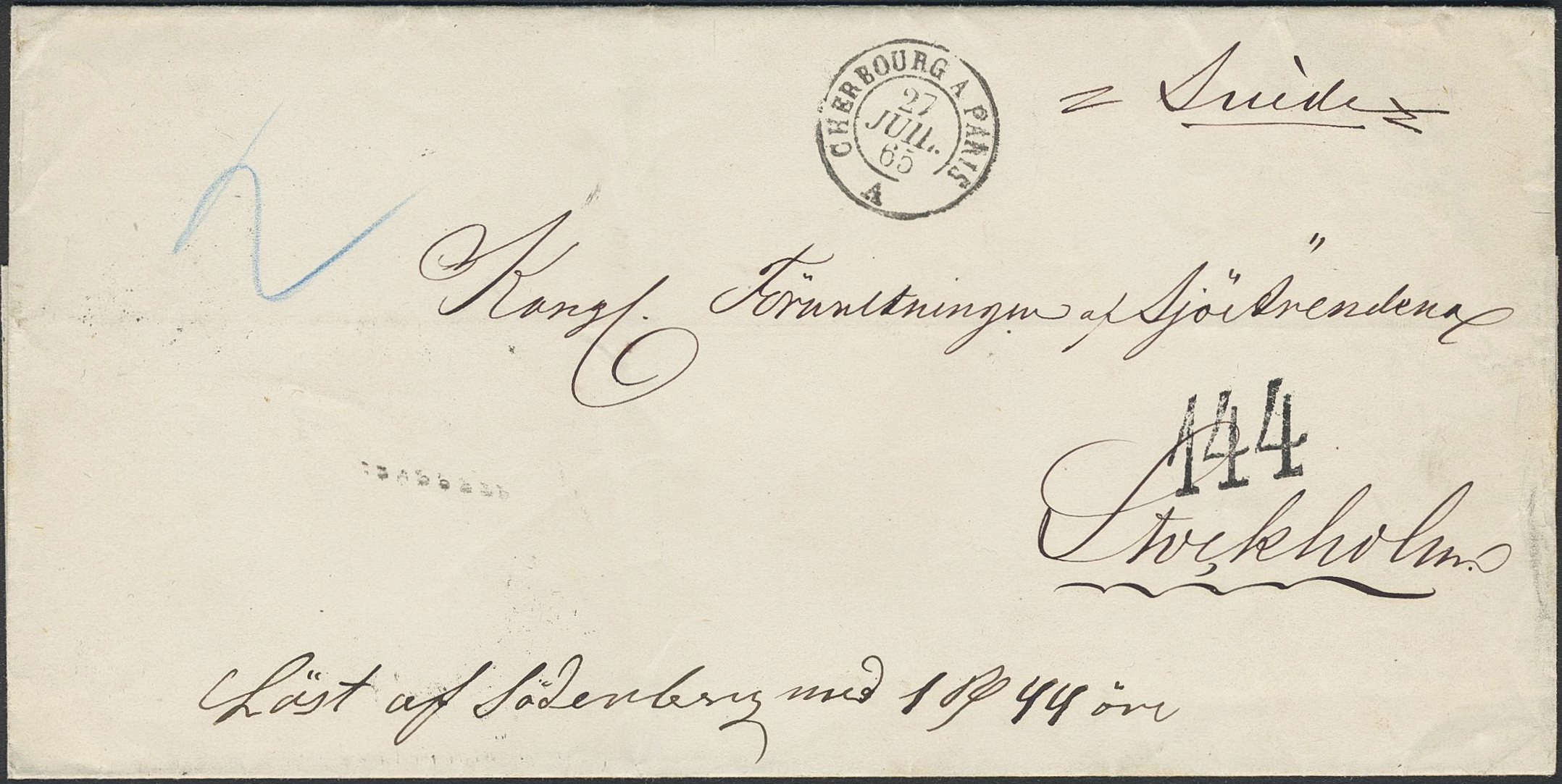 Sweden. Lösenförsändelser. Postage due mark 144 on 2-fold cover sent from France, cancelled CHERBOURG A PARIS 27.JUIL 65 and SÖDRA ST.BANAN 31.7.1865. Notation 'Löst af Söderberg med 1 R 44 öre'. Superb.