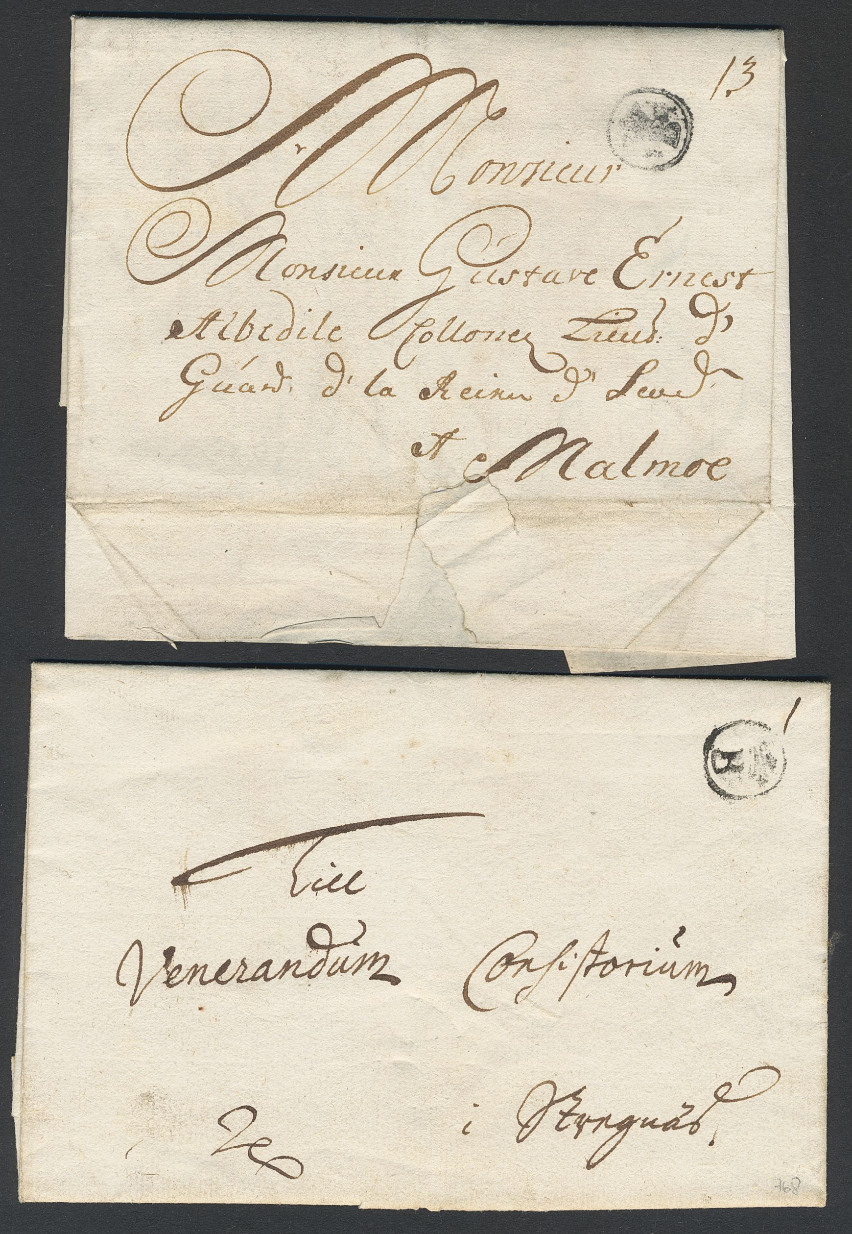 Sweden. B och F-stämplar. B cancellation type 2 on letter dated 'Stockholm 17 Noveb Ao 1688' sent to Malmö. Small tear in the bottom. Also on cover without content with type 5(?). Postal: 2000:-