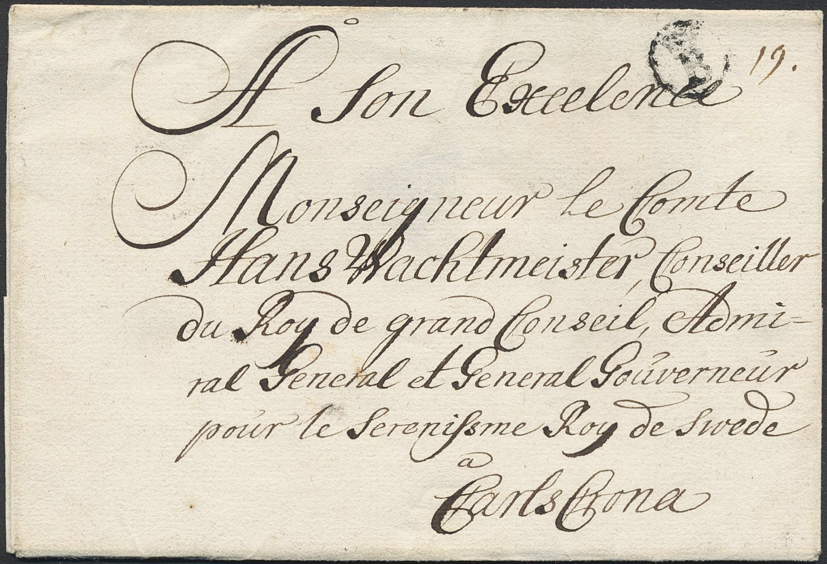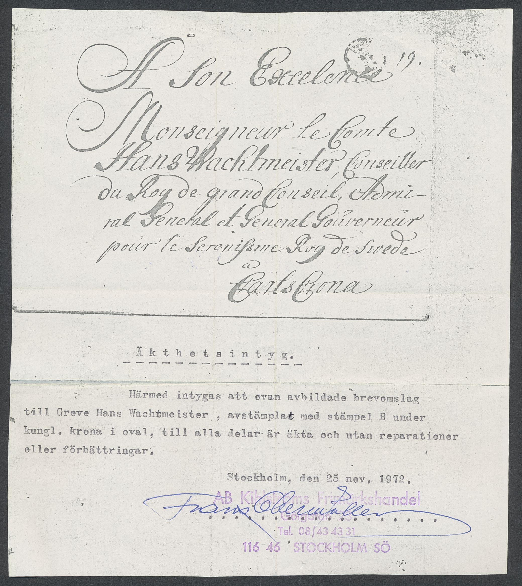 Sweden. B och F-stämplar. B postmark type 3 on cover sent to Hans Wachtmeister, Karlskrona. Back with small paper loss after removed seal. Certificate Franz Obermüller (1972).