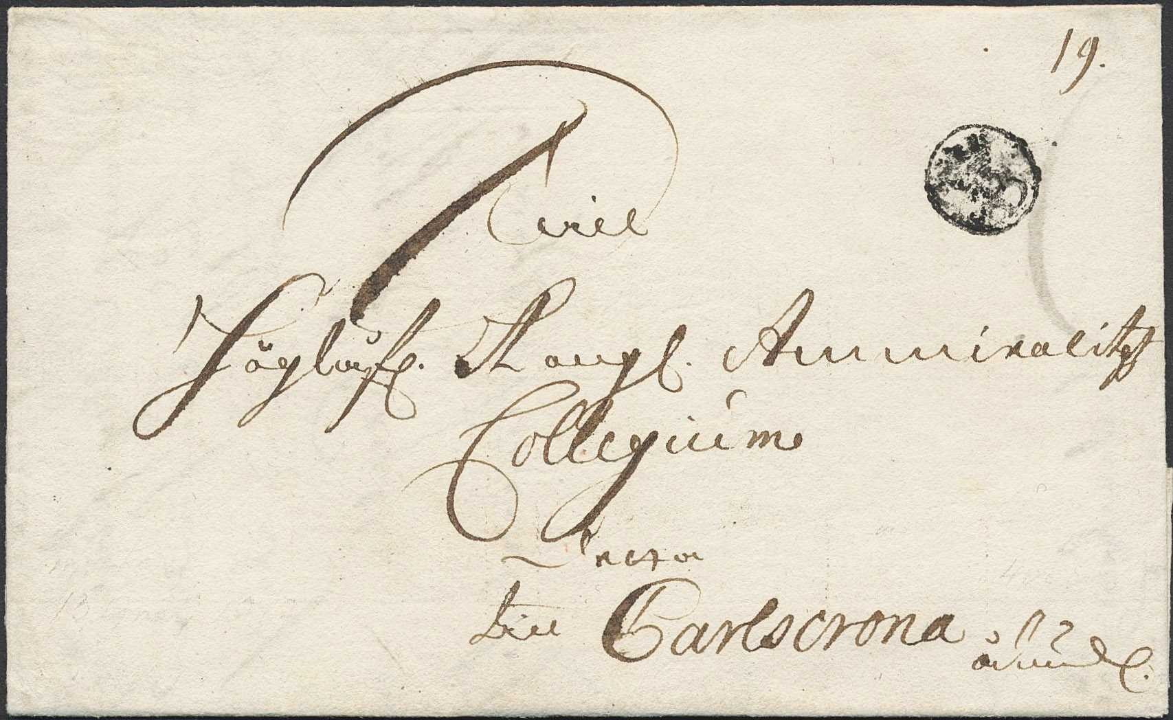 Sweden. B och F-stämplar. B postmark type 4 on letter dated 'Stockholm d 13 Julj Ao:1707', sent to Karlskrona.