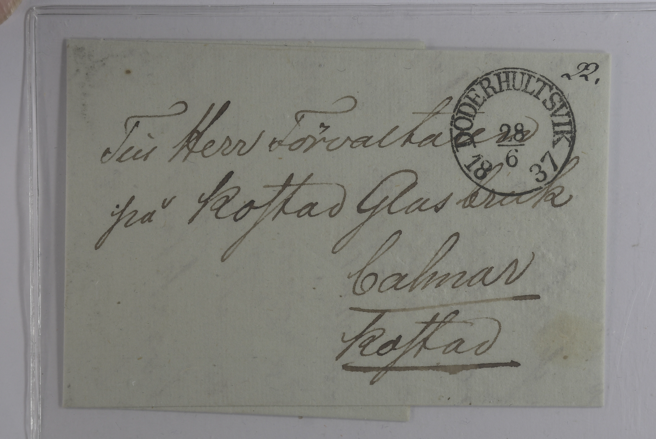 Sweden. H county. DÖDERHULTSVIK 28.6.1837, arc postmark. Excellent cancellation on cover with contents, sent to Kosta. Postal: 2000:-