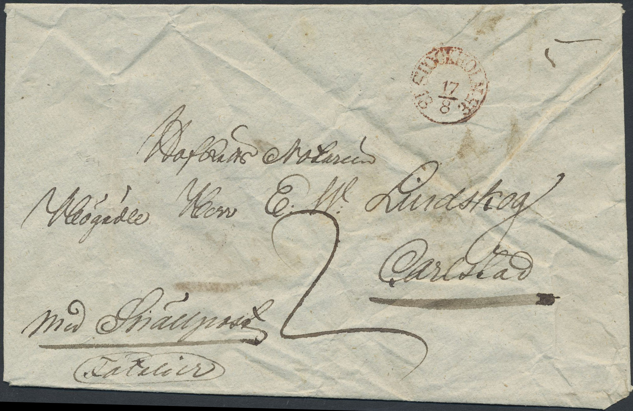 Sweden. A county. STOCKHOLM, arc postmark. Type 9 in red colour on re-used cover with notation 'Med Snällpost' (by Express mail), sent to Karlstad. Very scarce. Postal: 8000:-