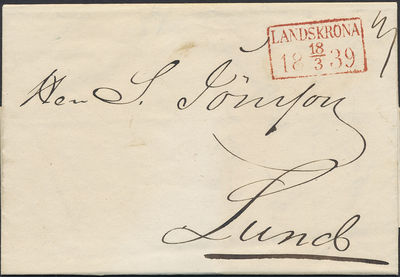 Sweden. M county. LANDSKRONA 18.3.1839, rectangular postmark. Pmk in red colour on cover sent to Lund. Superb. Postal: 15000:-