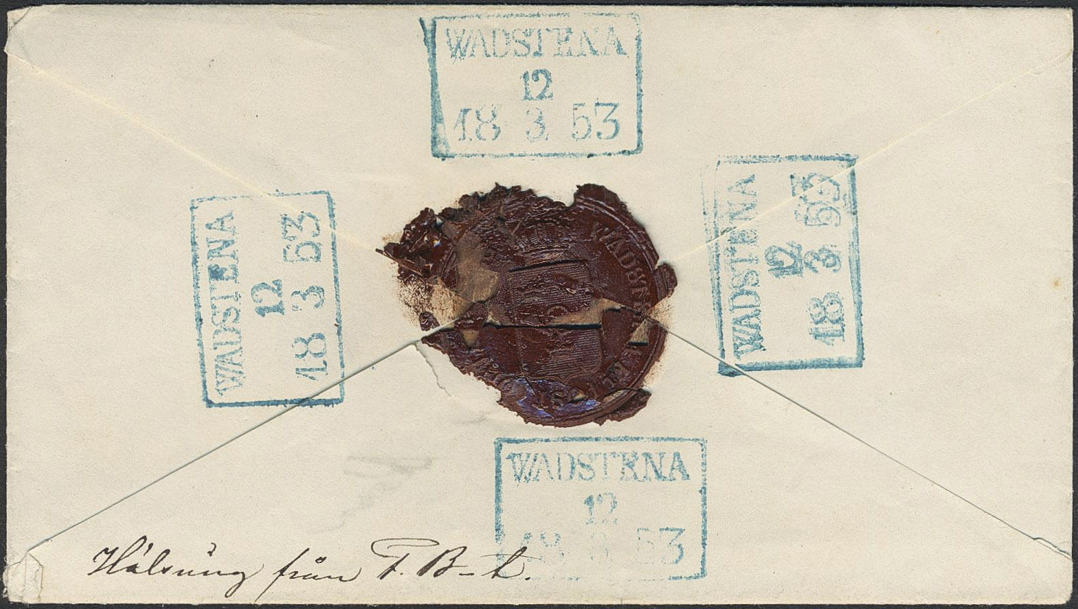 Sweden. E county. WADSTENA 12.3.1853, rectangular postmark. Type 3 in blue colour on cover sent to Eksjö. On the reverse four further strikes of the pmk, plus a seal. Decorative item.