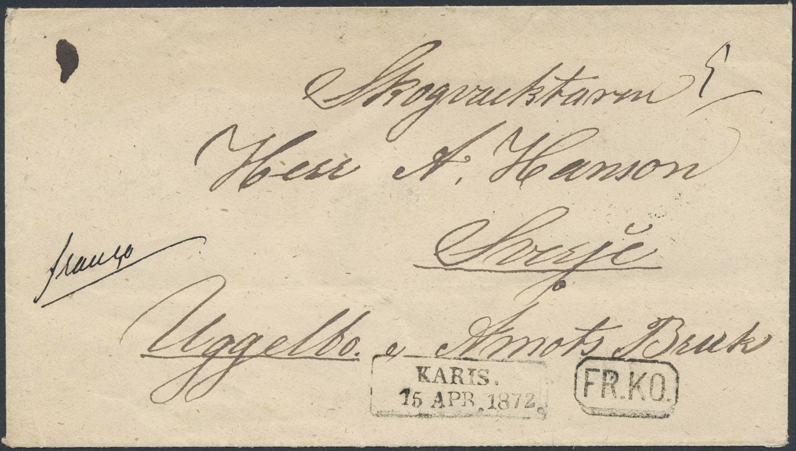 Sweden. Foreign-related cover. Finland. Prepaid cover sent from KARIS 15.APR.1872 via STOCKHOLM N:r 7 24.4.1872 (P: 2000) to Uggelbo.