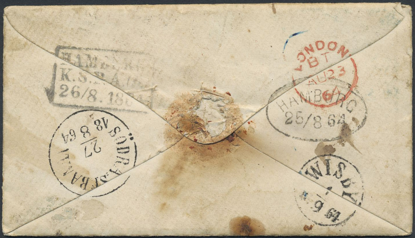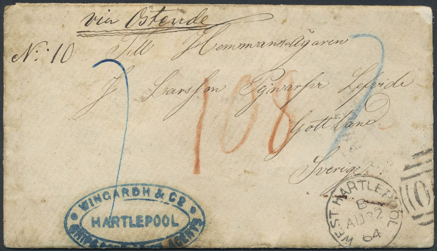 Sweden. Foreign-related cover. Great Britain. Unpaid cover with content sent from WEST HARTLEPOOL 22.AU.64 via HAMBURG K.S.P.A.(D.) 26.8.1864 and SÖDRA ST:BANAN 27.8.1864 to WISBY 1.9.1864.