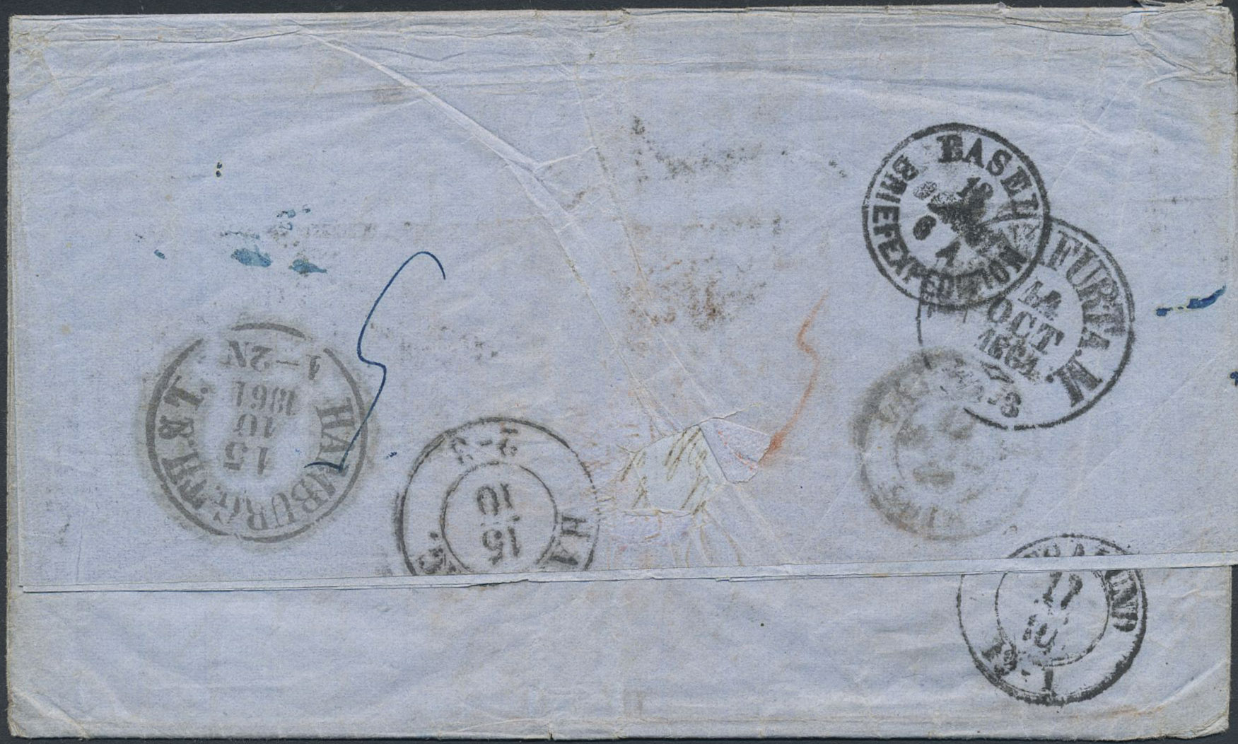 Sweden. Foreign-related cover. Switzerland. Unpaid letter (worn) sent from VERNER 12.OCT.61 via HAMBURG TH&T 15.10.1861 and YSTAD 18.10.1861 to Kalmar.