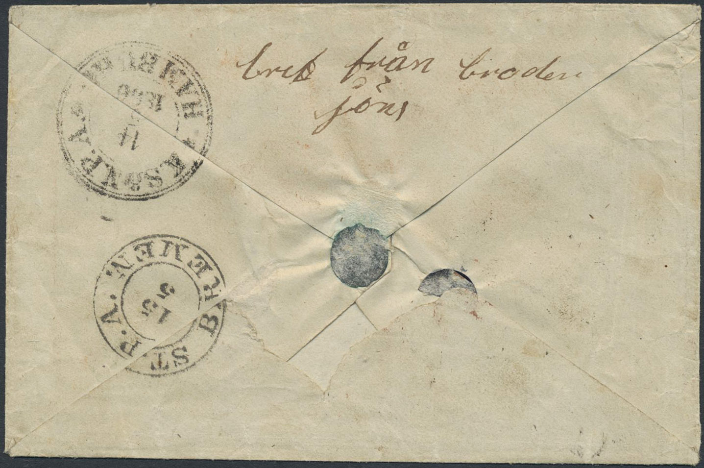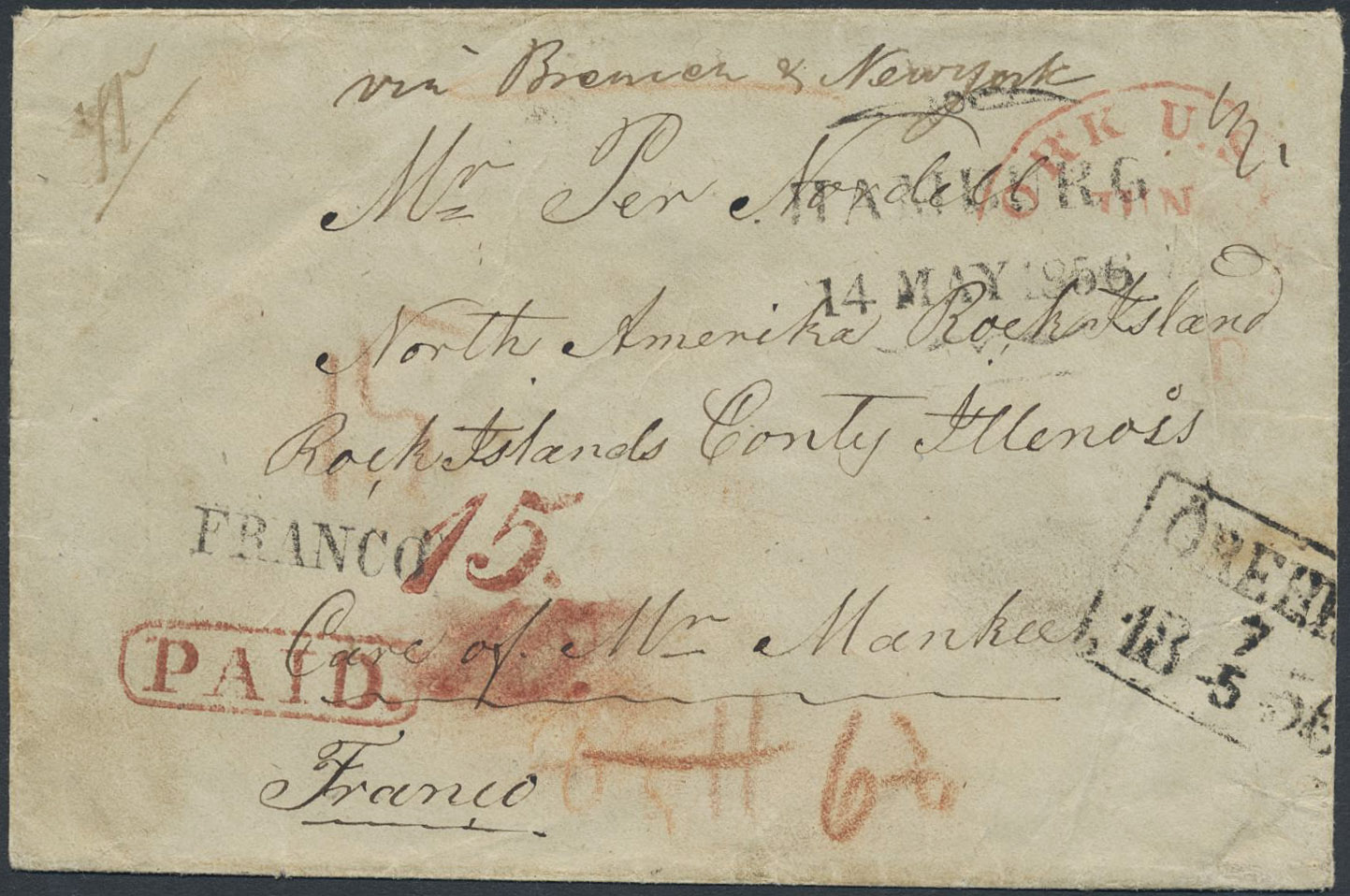 Sweden. Foreign-related cover. USA. Prepaid cover sent from ÖREBRO 7.5.1856 via HAMBURG 14.MAY.1856, ST.P.A. BREMEN 15.5 and NEW YORK to Rock Island, Illinois.