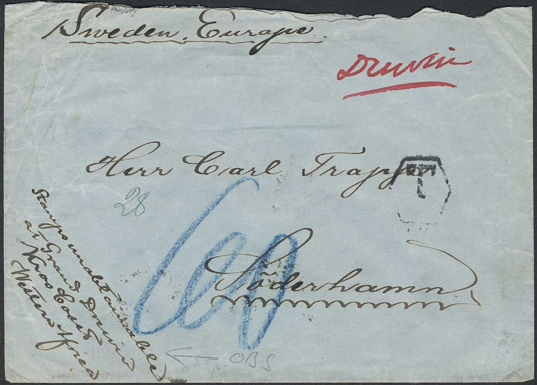 Sweden. Foreign-related cover. West Africa. Unpaid cover with notation ' Stamps unablainable at Grand Drevien Kroo Coast Western Africa' sent to SÖDERHAMN.