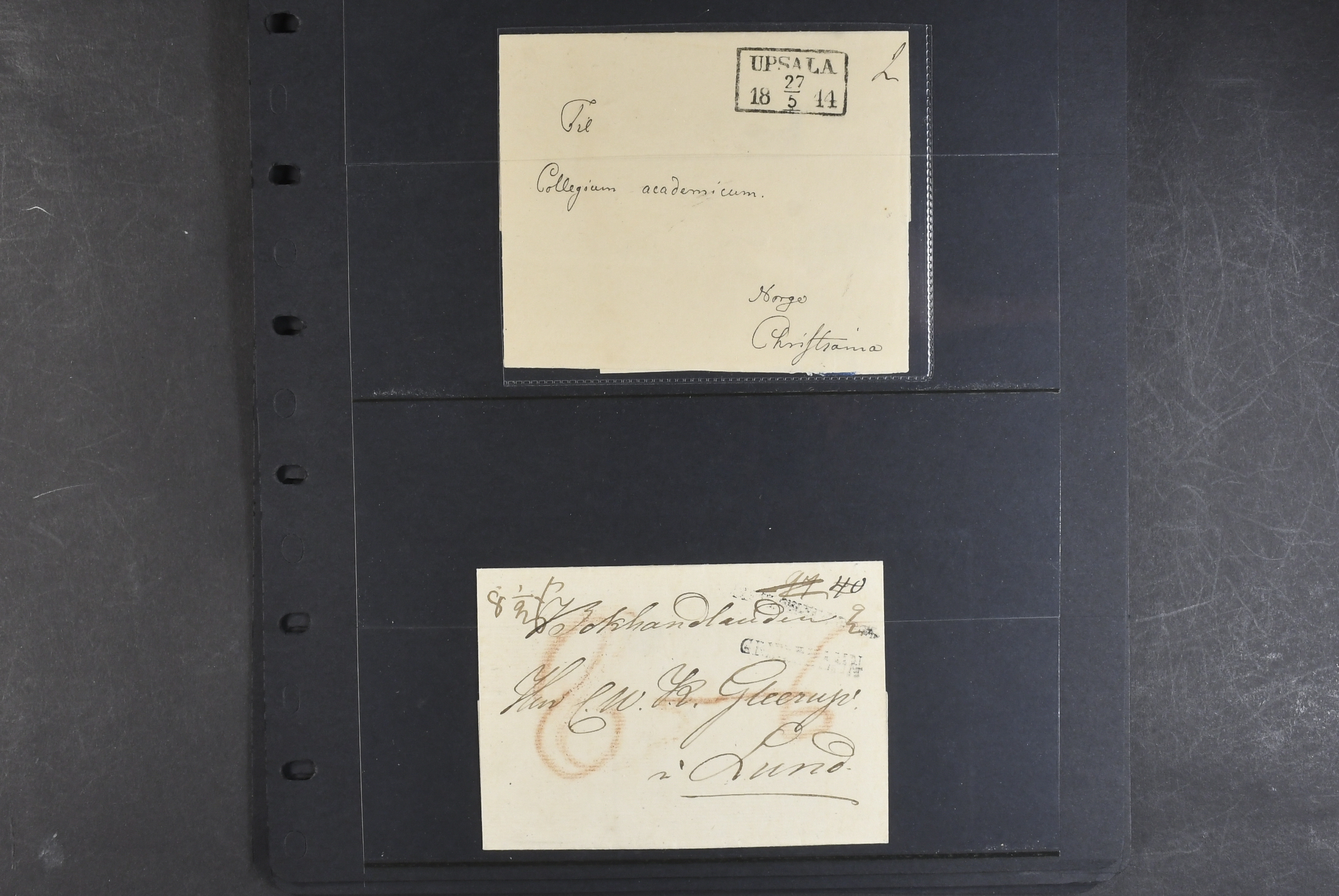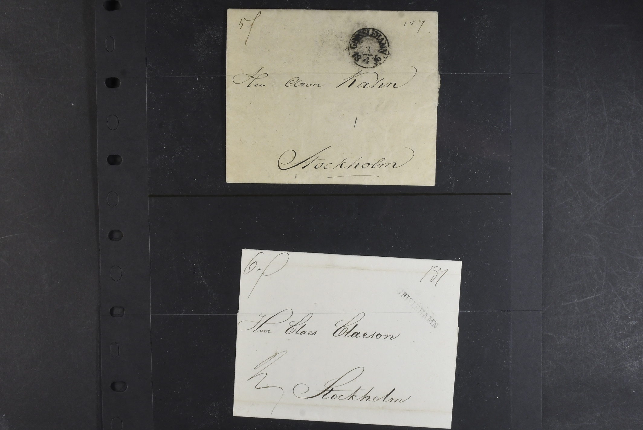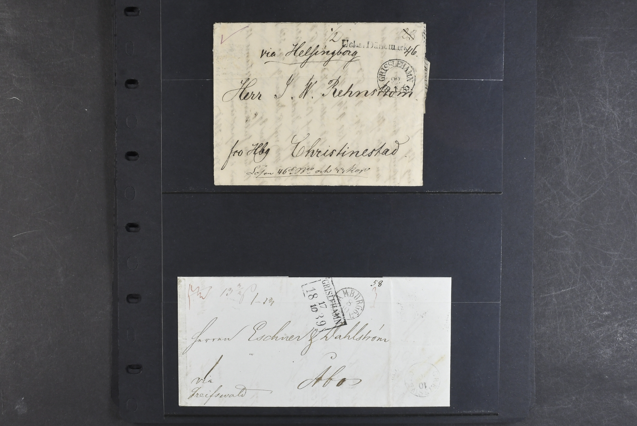 Sweden. Prephilately, collection FOREIGN-RELATED 1820–1861 on visir leaves. Mostly incoming covers and a few in transit to Finland. One cancelled with GISSLEHAMN in red colour in 1845. (14)