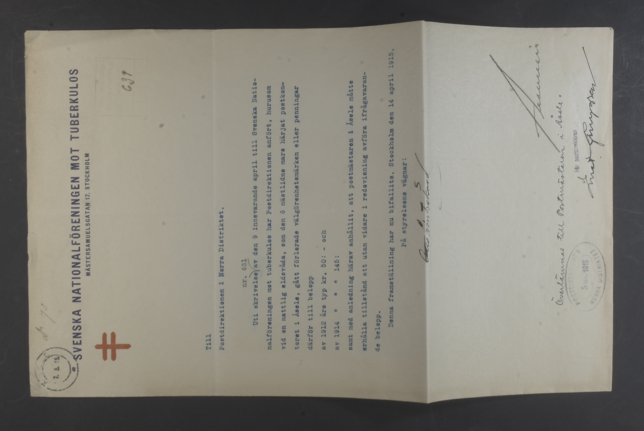 Sweden. Postal documentation, Missive with letterhead from the Swedish National Association against Tuberculosis, regarding lost charity stamps or money, as a result of a fire at the post office in Åsele. Cancelled ÅSELE 7.5.15. Highly interesting 'Interrupted mail'-related item.