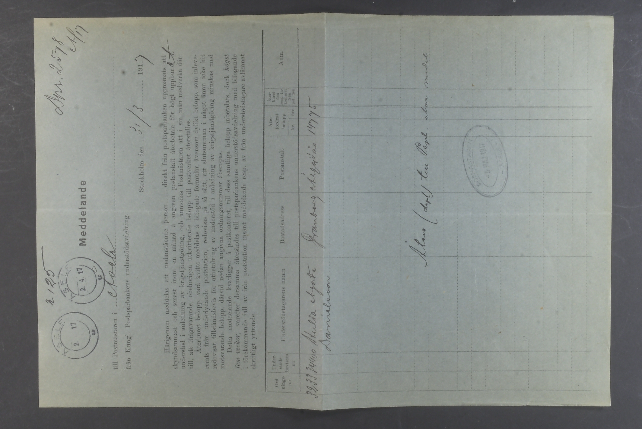 Sweden. Postal documentation, AC-county. Letter from the Royal Postal Savings Bank (Postsparbanken) and the welfare department, regarding the excessive support due to military service with a request for immediate repayment of the same. The form is cancelled ÅSELE 2.4.17. Scarce.